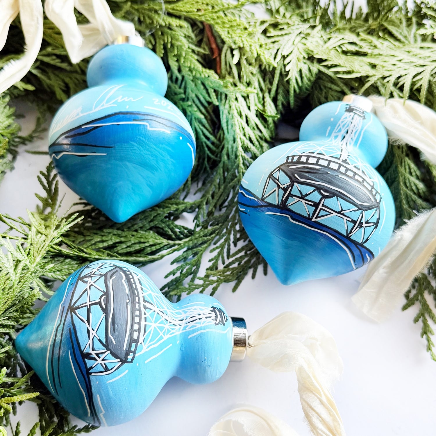 CERAMIC BISQUE ORNAMENTS HAND PAINTED AND FINISHED WITH SARI SILK RIBBONS. EACH ORNAMENT IS SIGNED AND DATED.