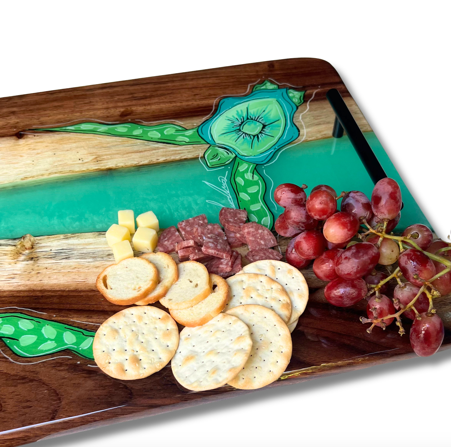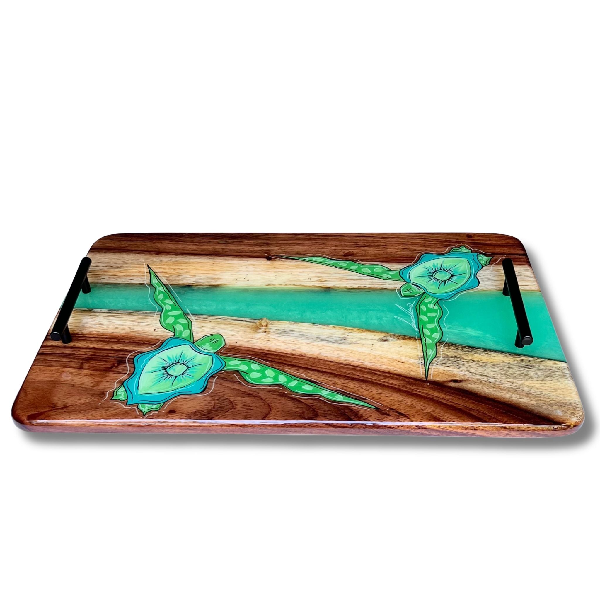 Our SERVING TRAYS have a full coat of epoxy finish. Our epoxy is all food safe but we do NOT recommend cutting on our SERVING TRAYS because the knife will scratch the epoxy finish.
