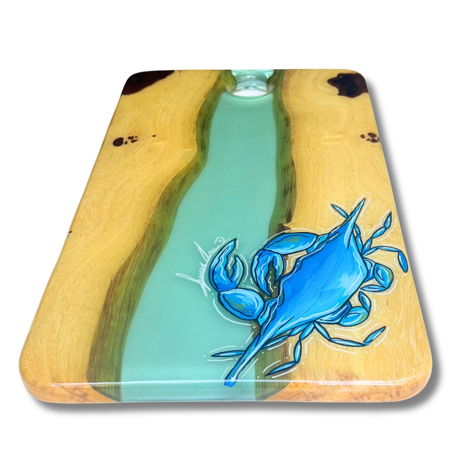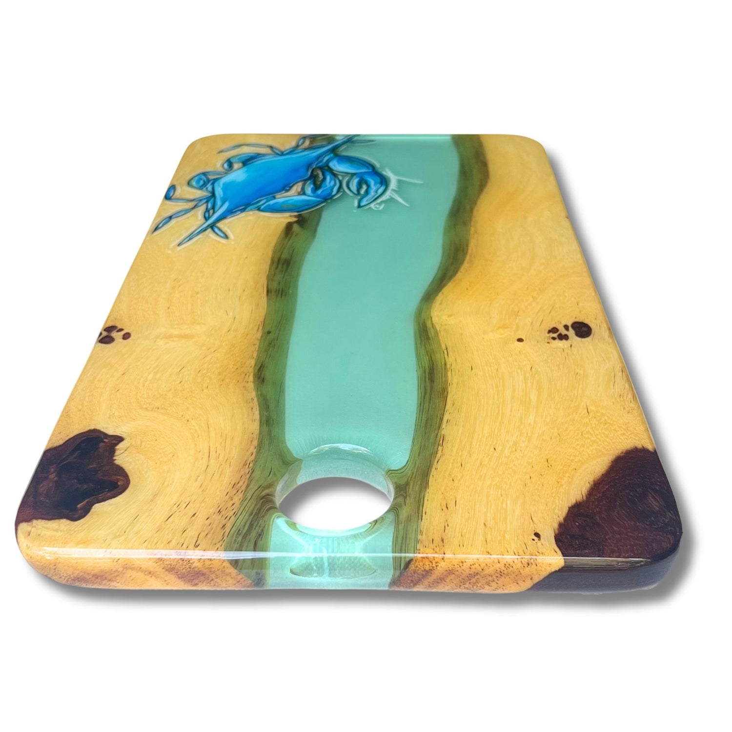 Our SERVING TRAYS have a full coat of epoxy finish. Our epoxy is all food safe but we do NOT recommend cutting on our SERVING TRAYS because the knife will scratch the epoxy finish.