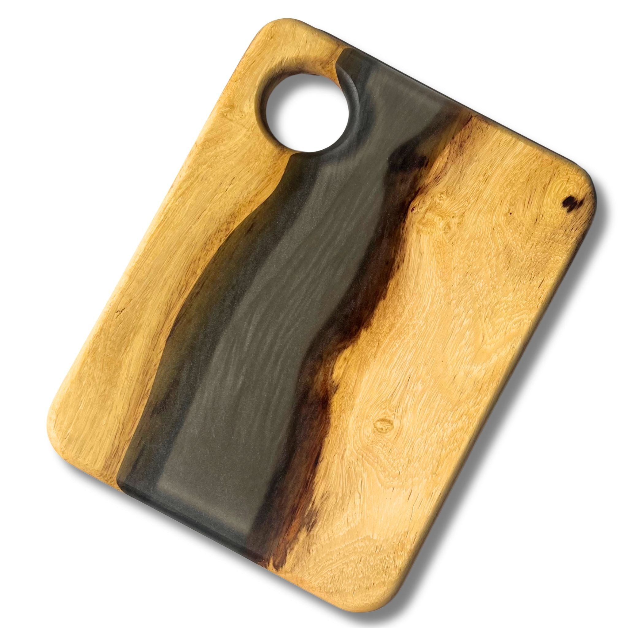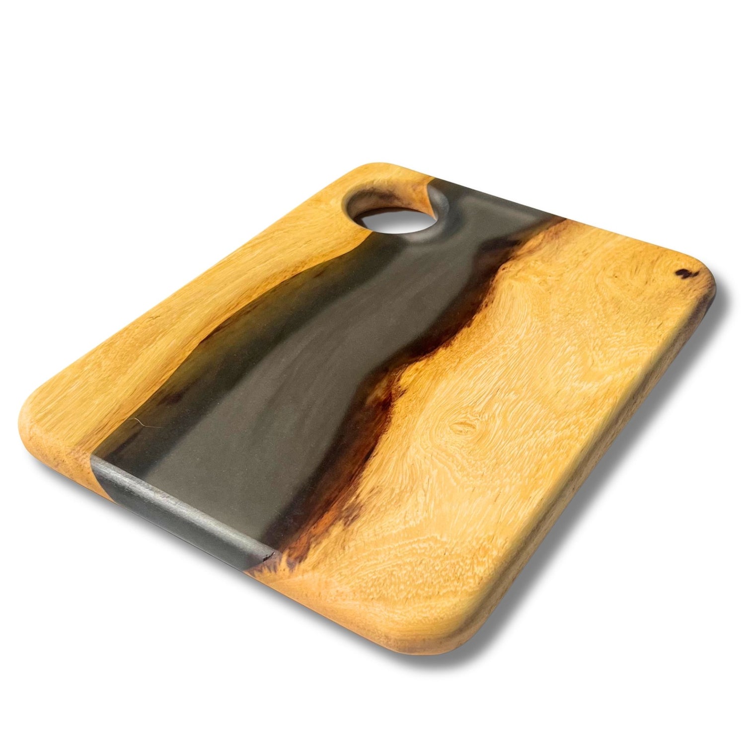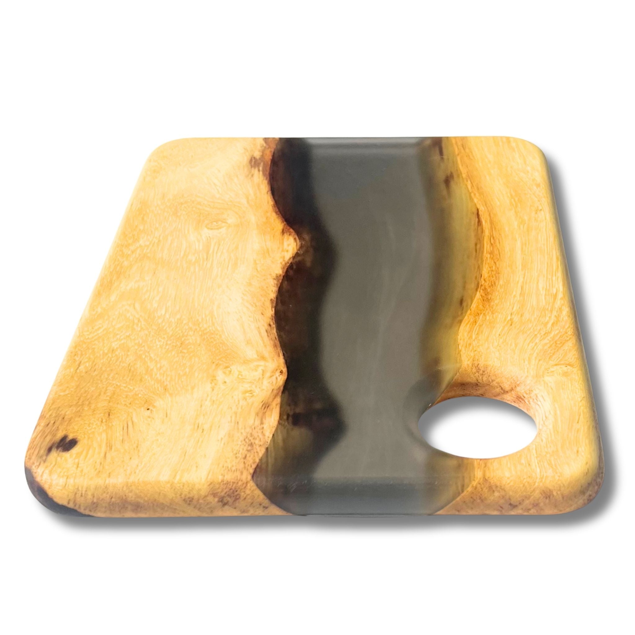 Our SERVING TRAYS have a full coat of epoxy finish. Our epoxy is all food safe but we do NOT recommend cutting on our SERVING TRAYS because the knife will scratch the epoxy finish.