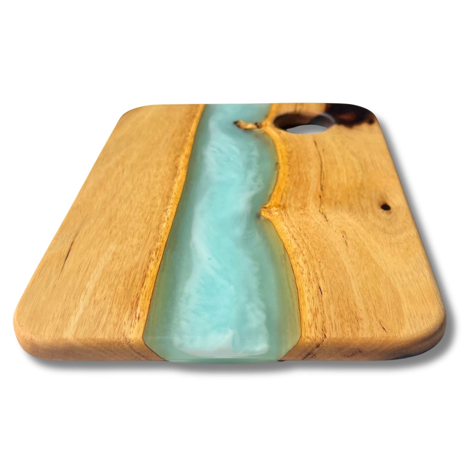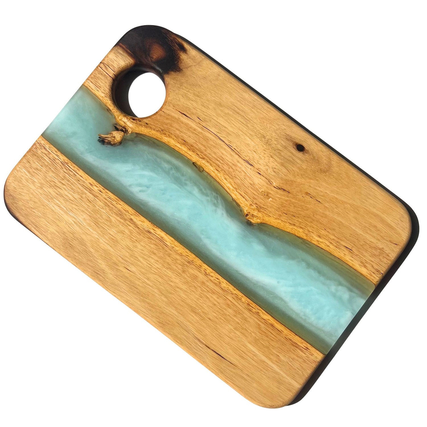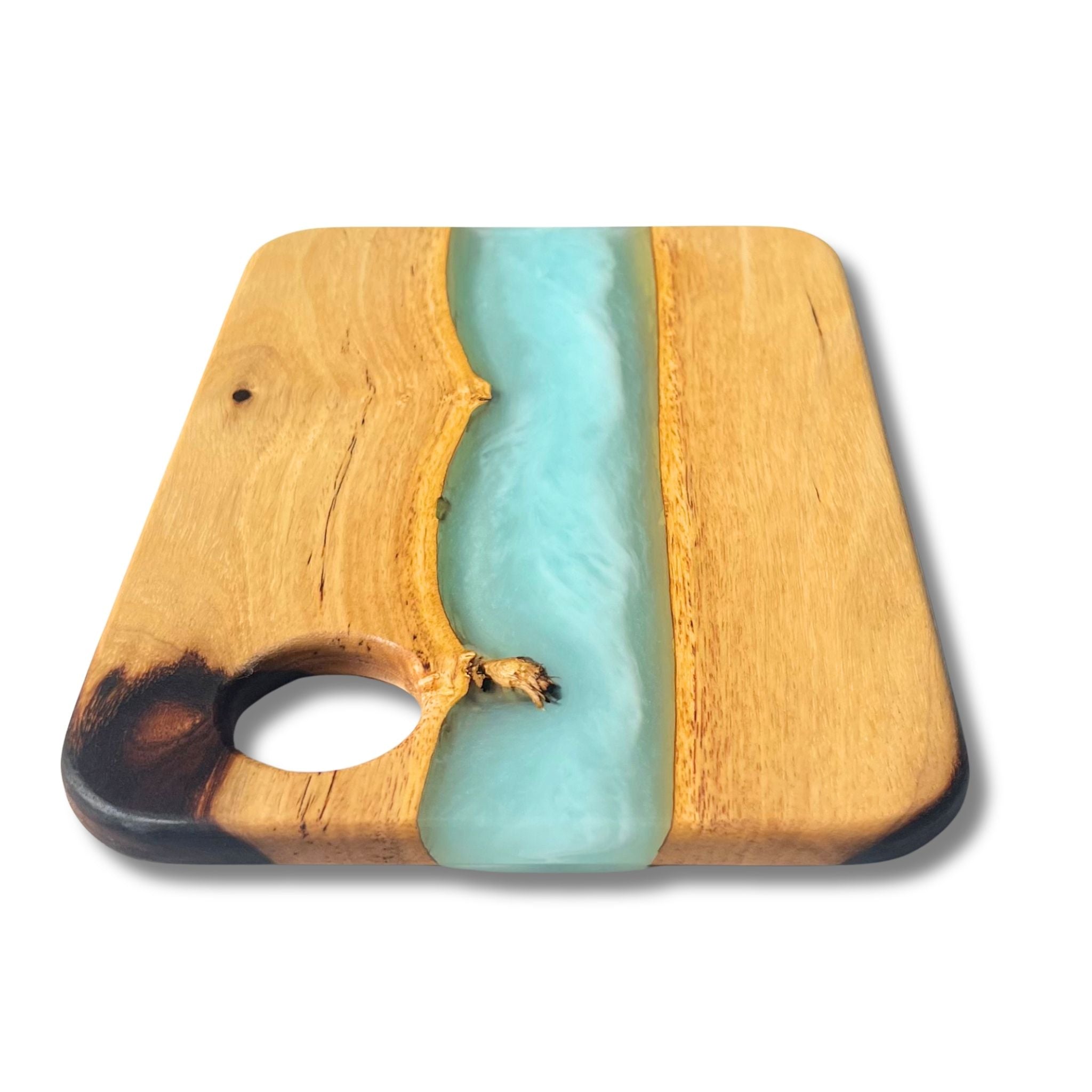 Our SERVING TRAYS have a full coat of epoxy finish. Our epoxy is all food safe but we do NOT recommend cutting on our SERVING TRAYS because the knife will scratch the epoxy finish.