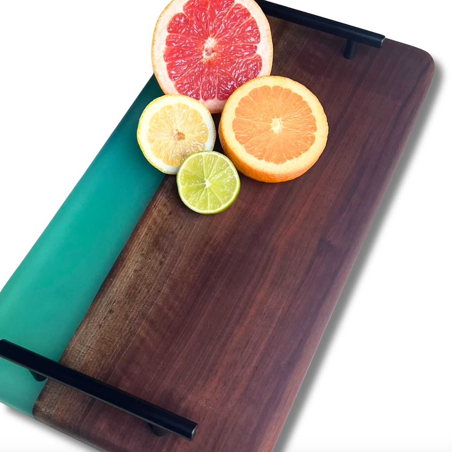 Our CUTTING BOARDS have a partial coat of epoxy finish. Our epoxy is all food safe but we do NOT recommend cutting on the areas with the epoxy finish because the knife will scratch the epoxy. We recommend using a cutting board oil every few months to ensure your boards stay bright and strong.