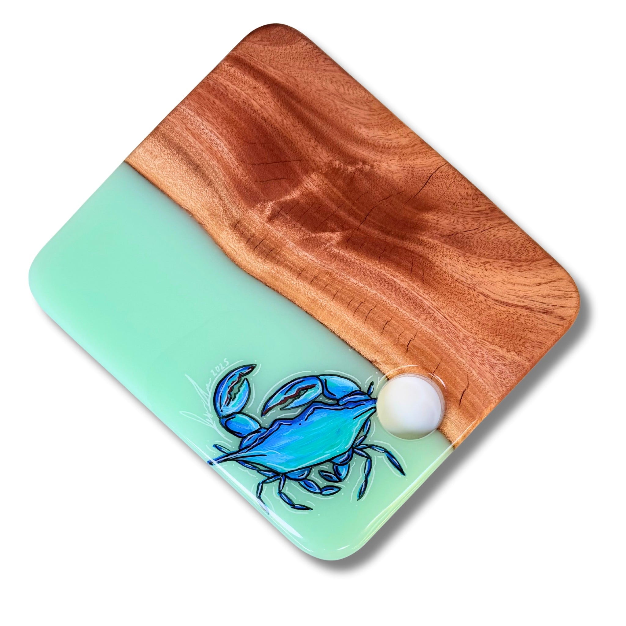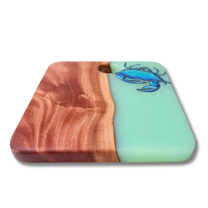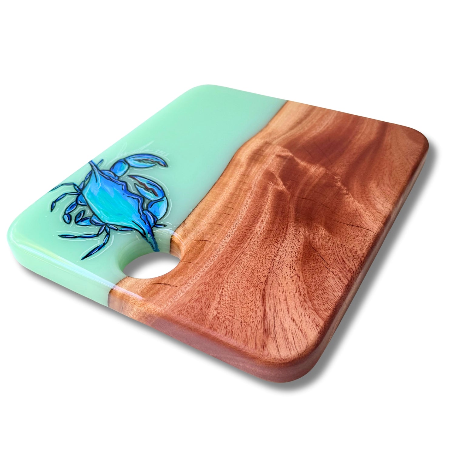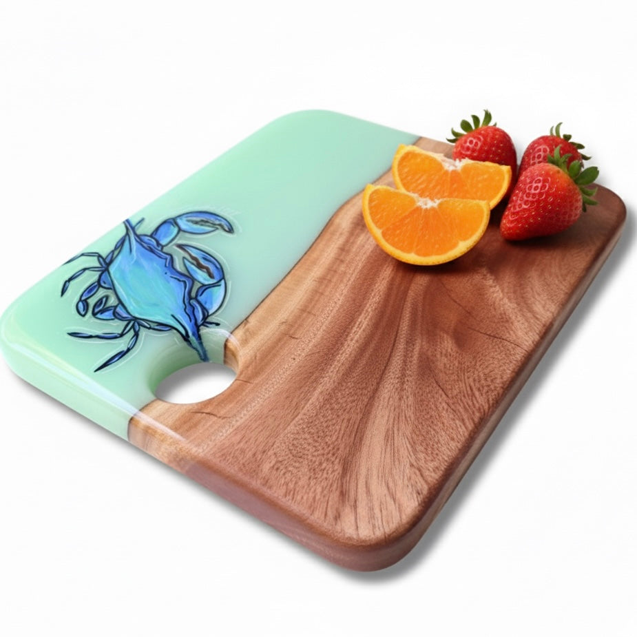 Each piece is sealed with a partial coat of food-safe epoxy that highlights the artwork while keeping the wood’s natural surface ready for everyday use. We recommend avoiding cutting directly on the epoxy areas to preserve the finish.