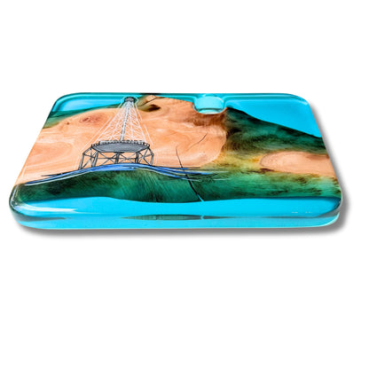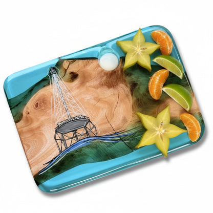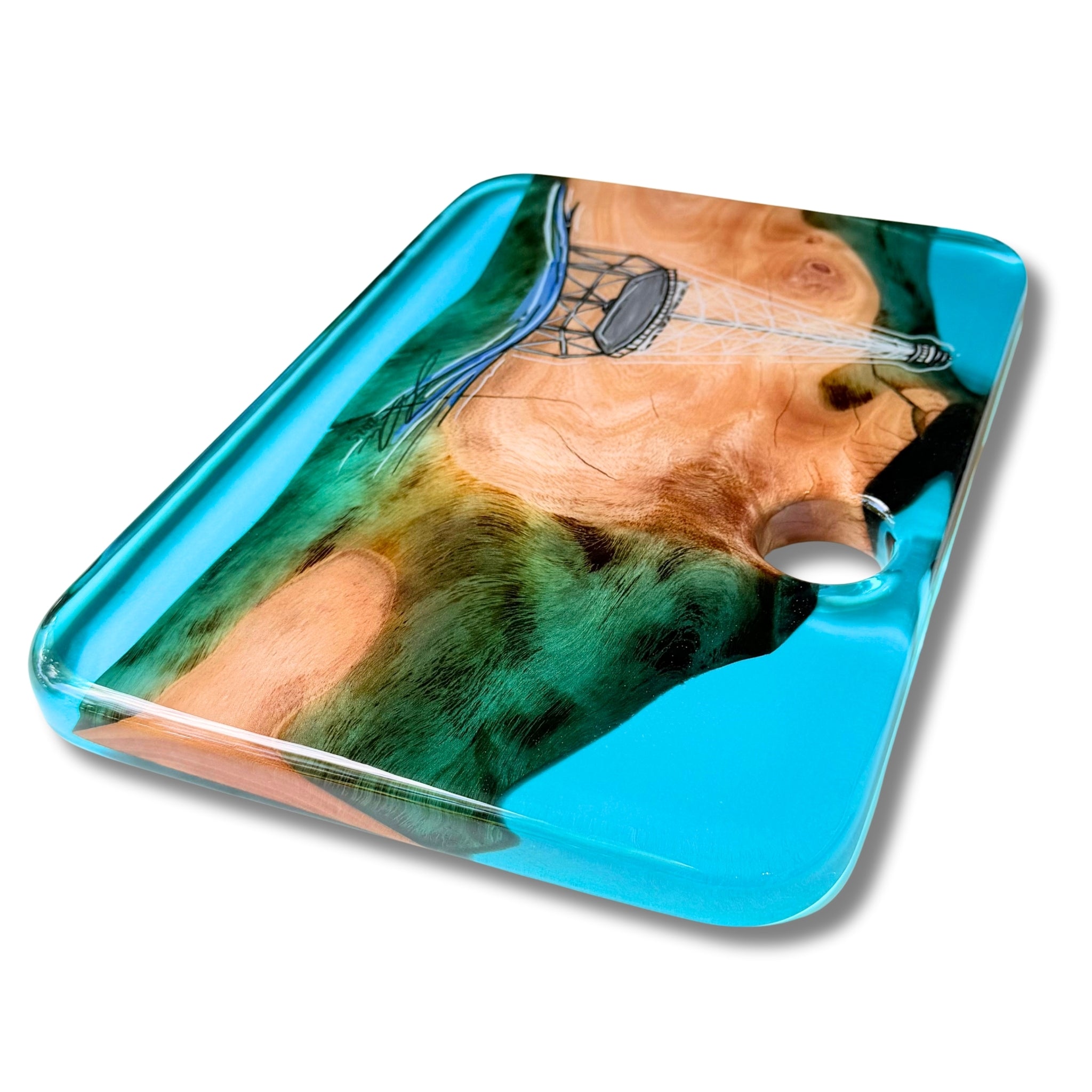 Finished with a durable, food-safe epoxy coating that gives it a beautiful glossy surface and long-lasting shine. While the epoxy is food safe, we recommend avoiding cutting directly on the tray to preserve its finish.