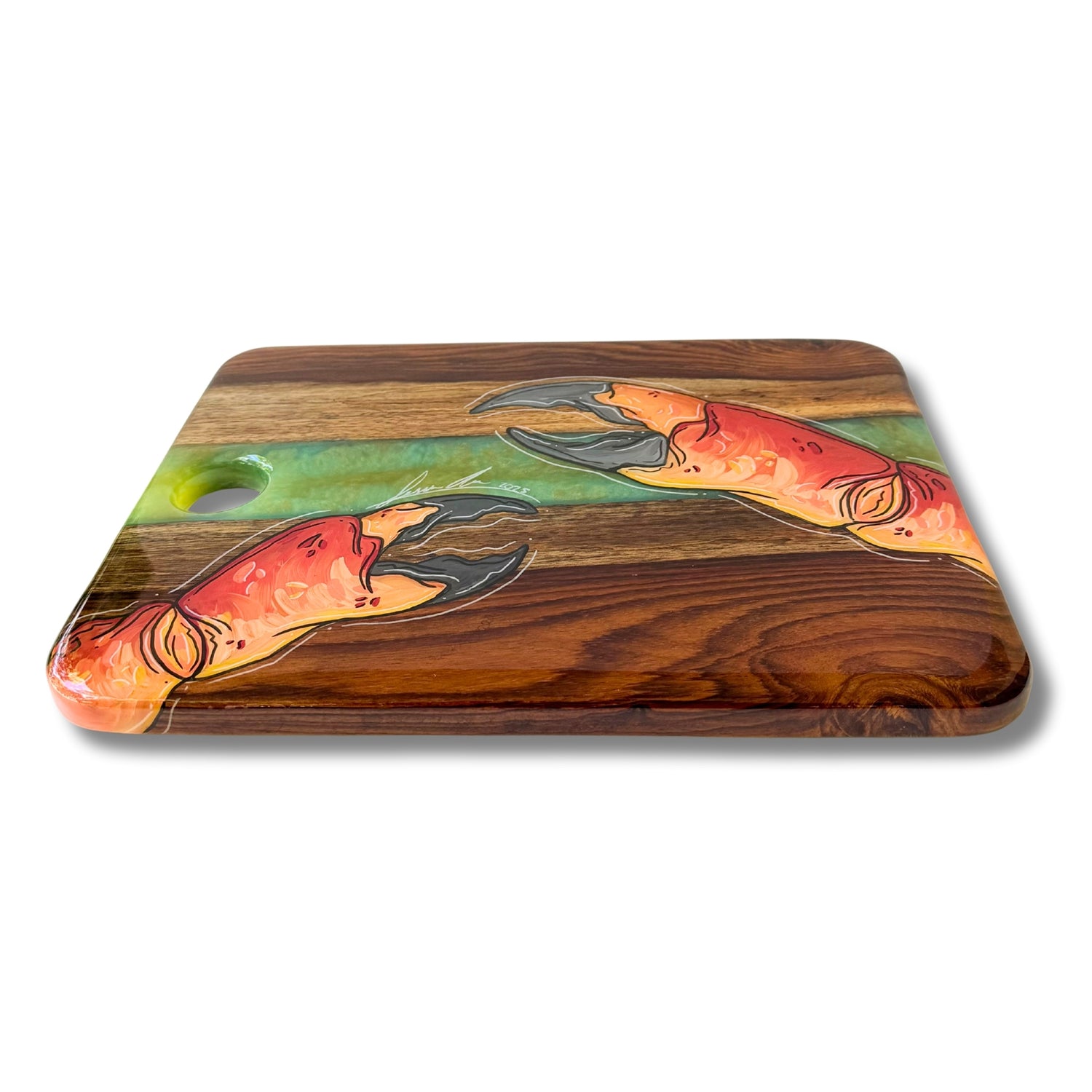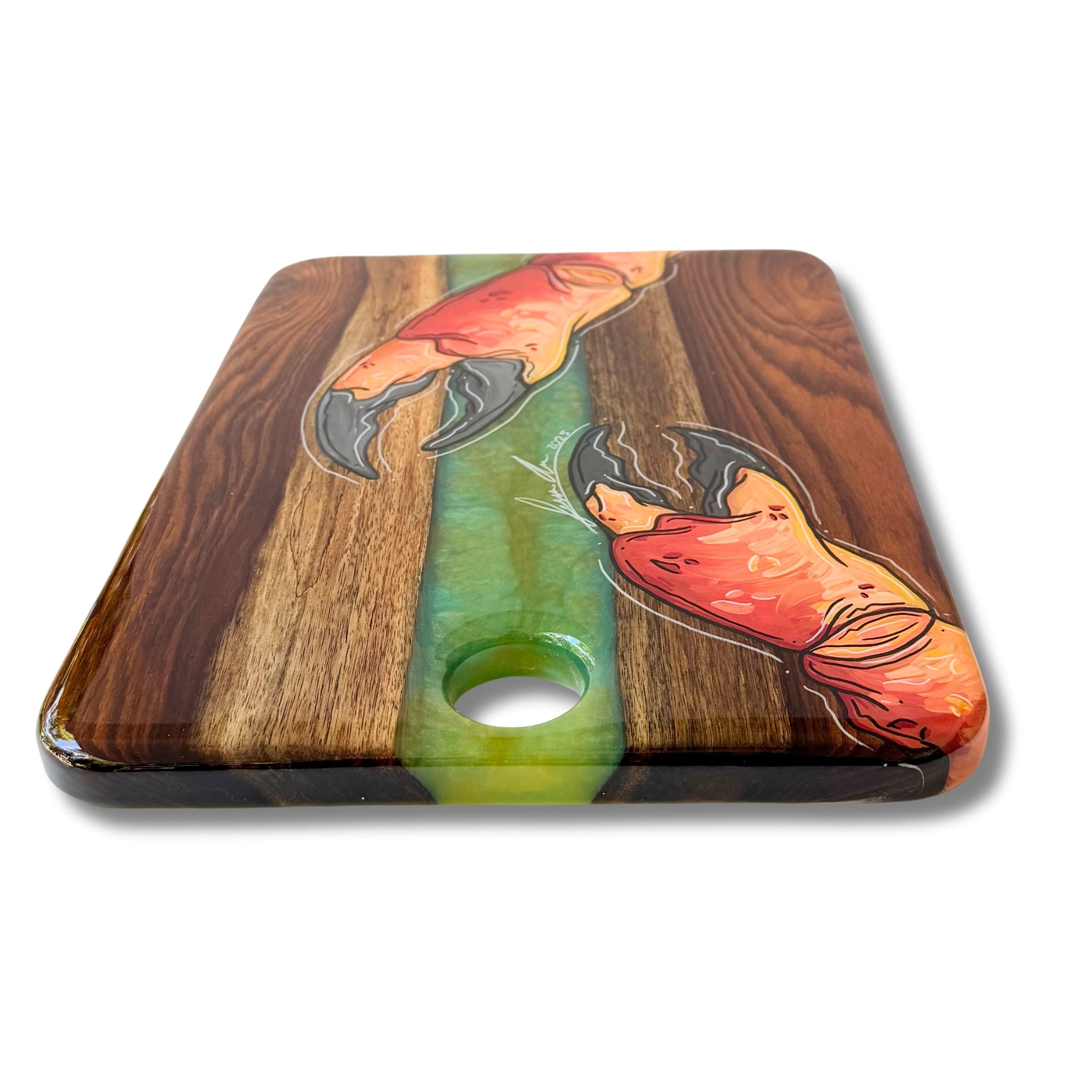 Finished with a durable, food-safe epoxy coating that gives it a beautiful glossy surface and long-lasting shine. While the epoxy is food safe, we recommend avoiding cutting directly on the tray to preserve its finish.