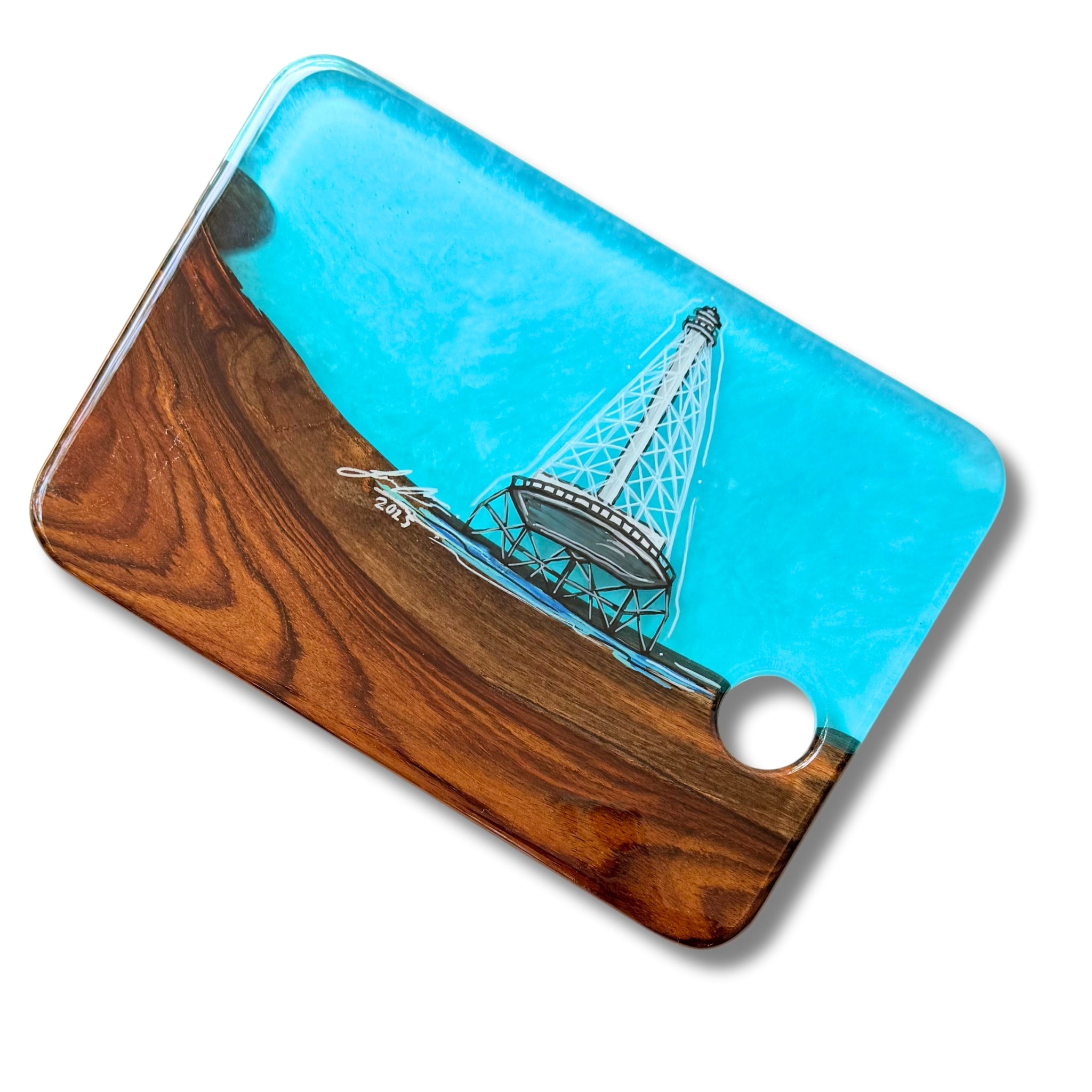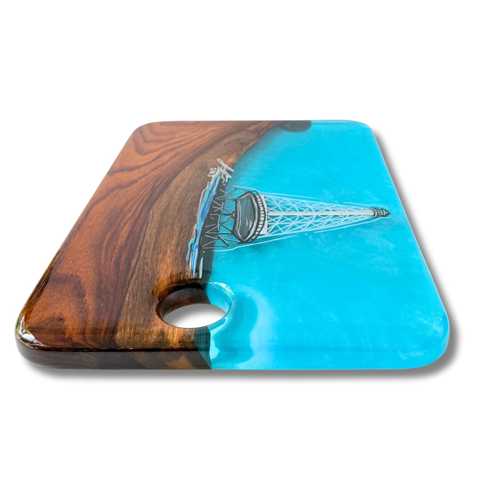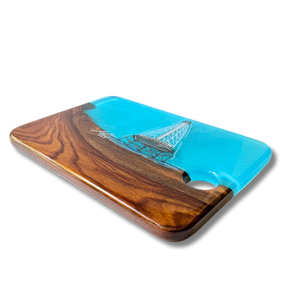 Finished with a durable, food-safe epoxy coating that gives it a beautiful glossy surface and long-lasting shine. While the epoxy is food safe, we recommend avoiding cutting directly on the tray to preserve its finish.