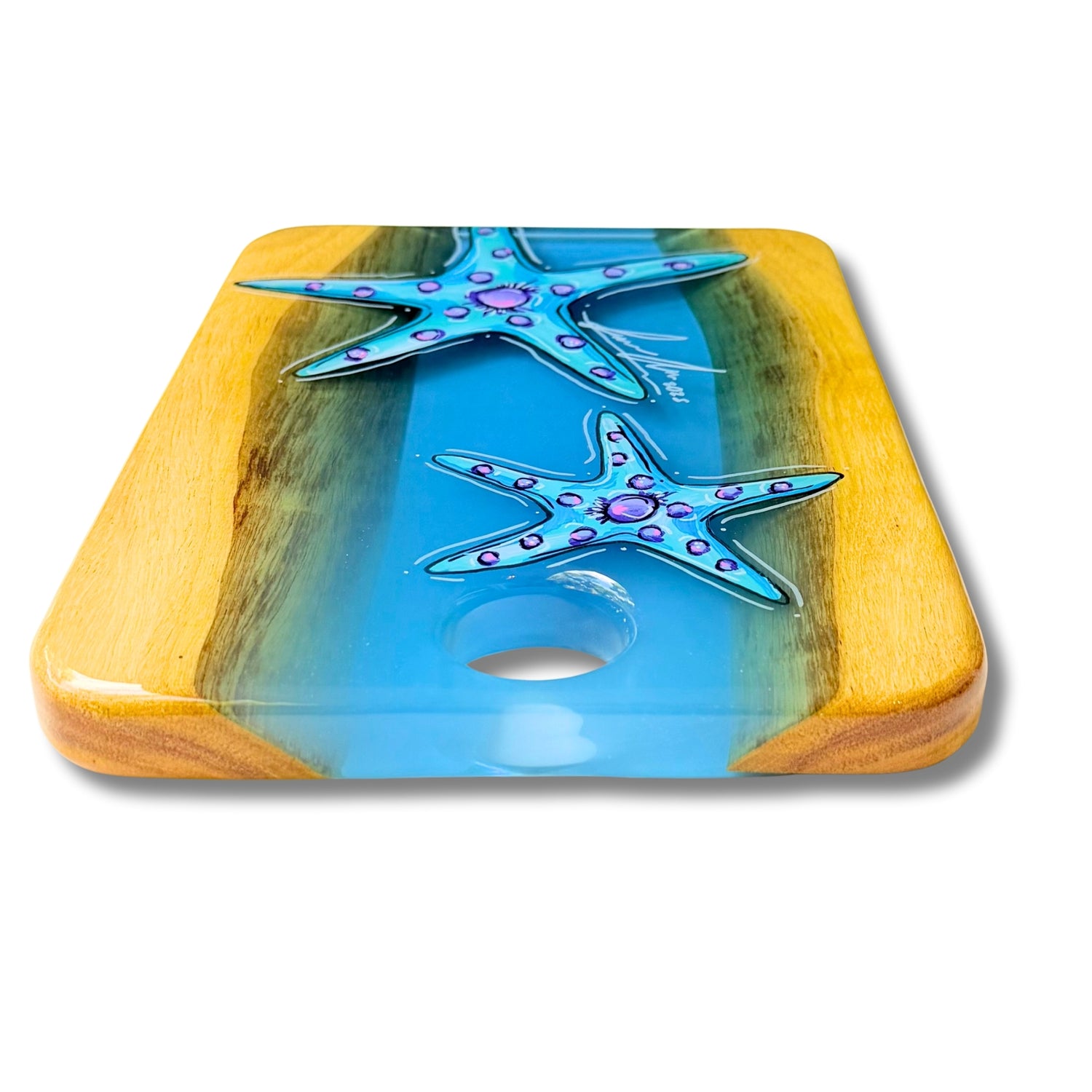 Finished with a durable, food-safe epoxy coating that gives it a beautiful glossy surface and long-lasting shine. While the epoxy is food safe, we recommend avoiding cutting directly on the tray to preserve its finish.