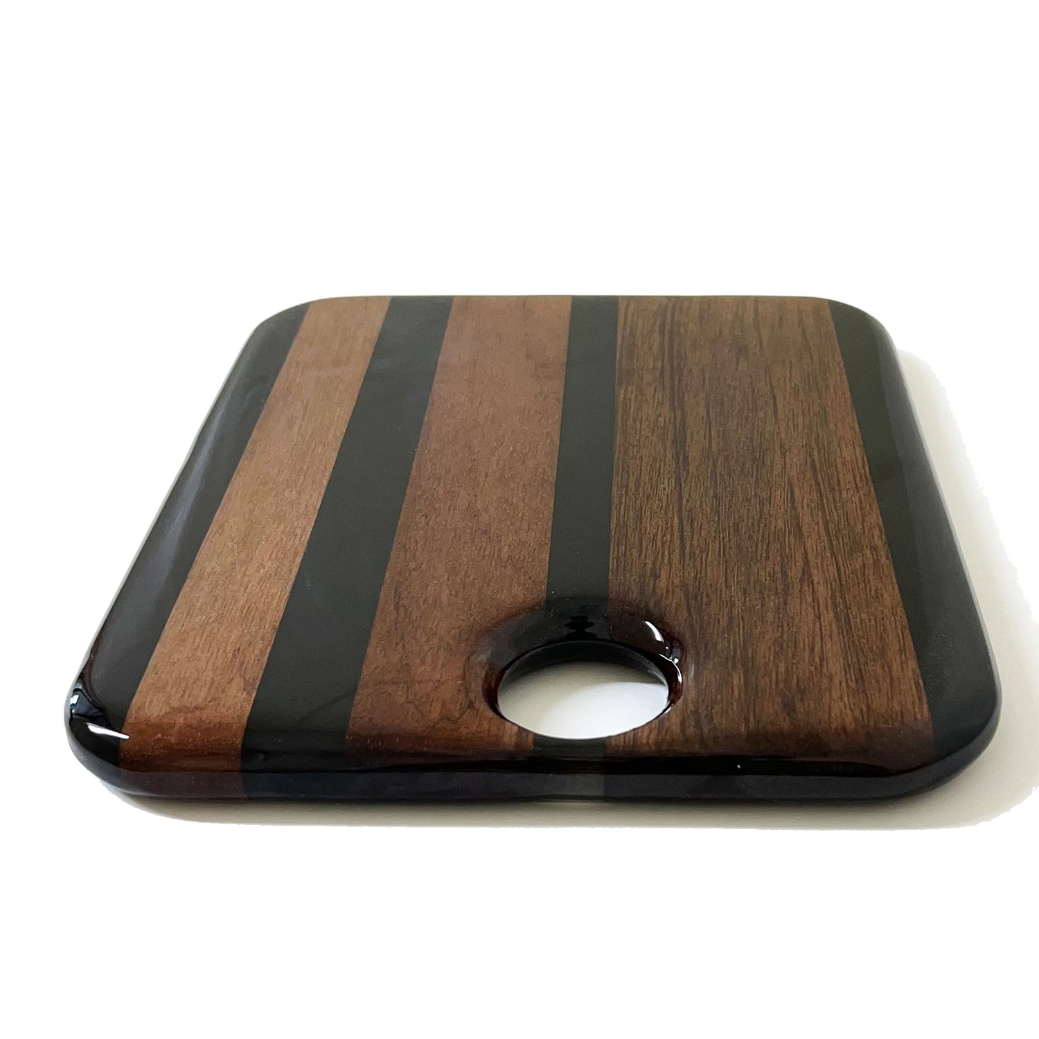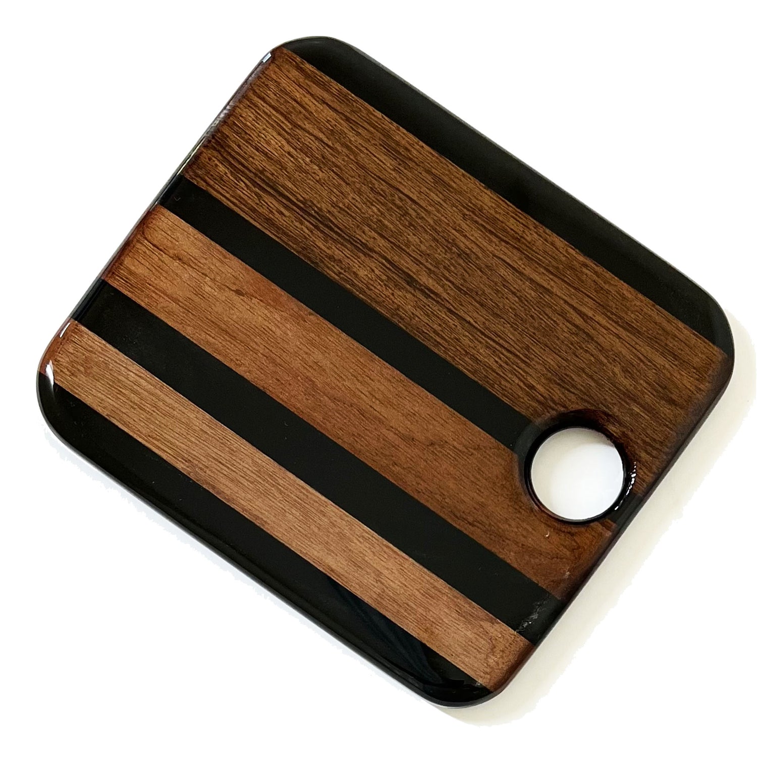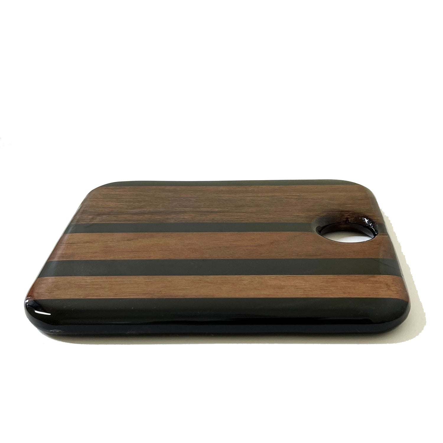 Our SERVING TRAYS have a full coat of epoxy finish. Our epoxy is all food safe but we do NOT recommend cutting on our SERVING TRAYS because the knife will scratch the epoxy finish.