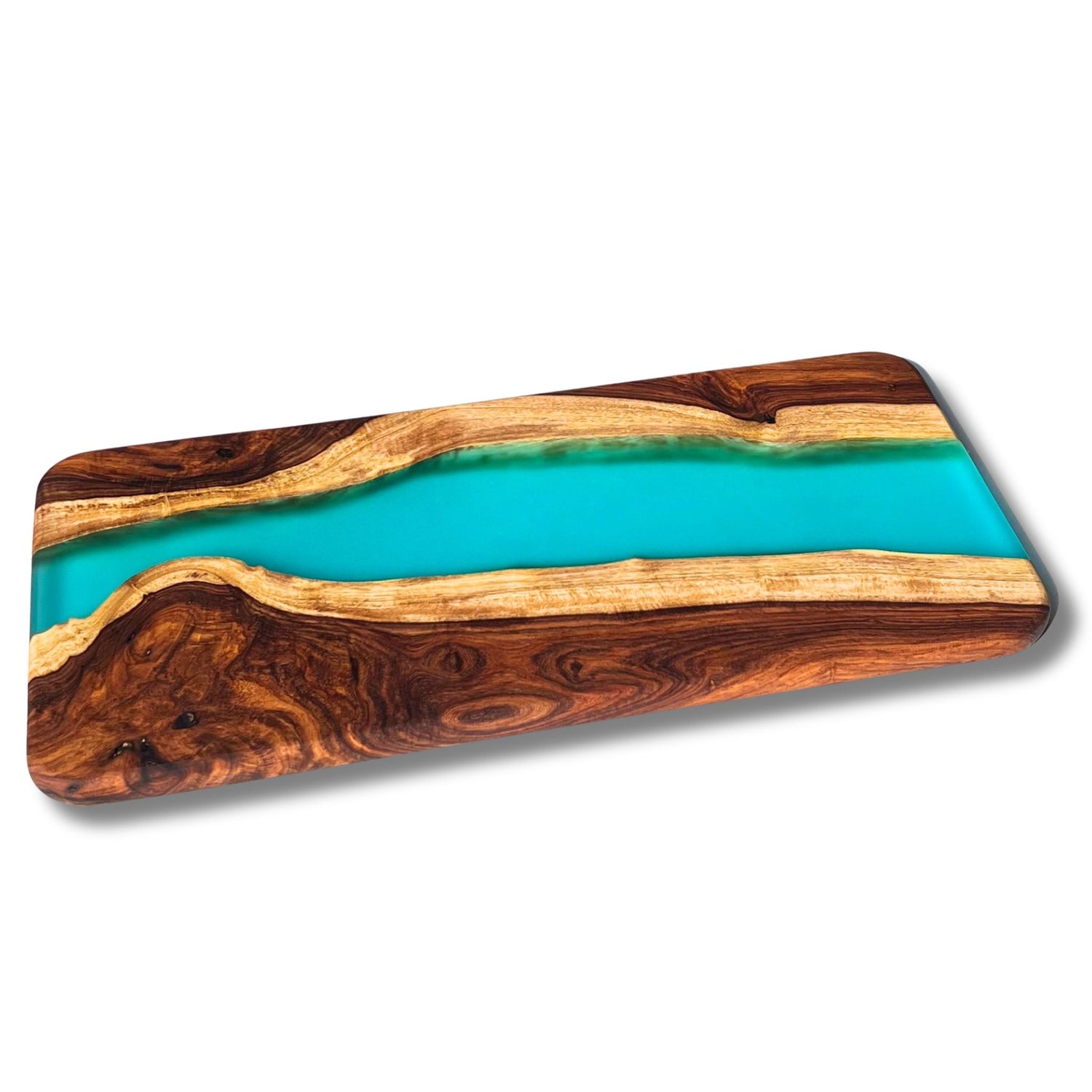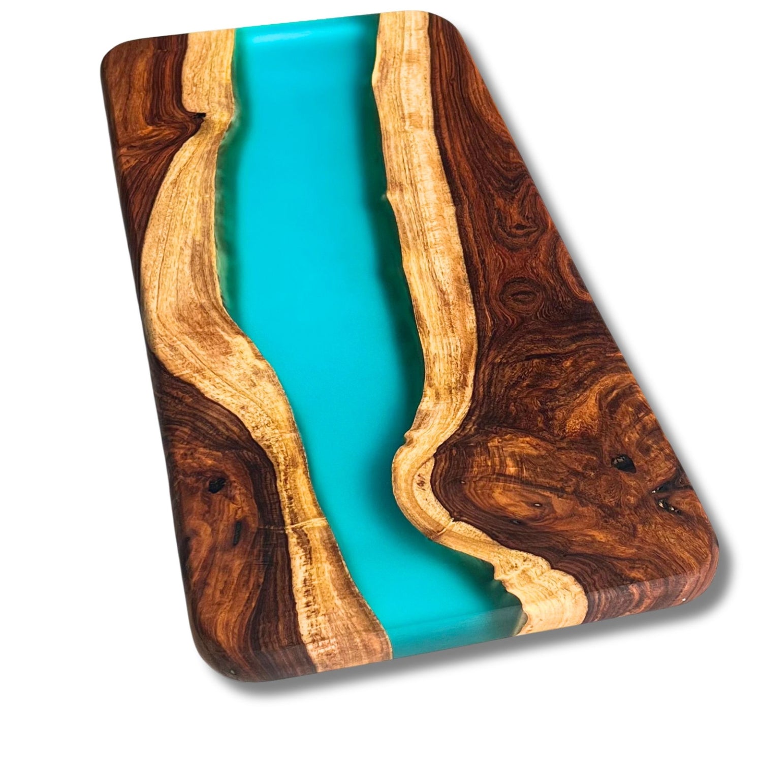 Our SERVING TRAYS have a full coat of epoxy finish. Our epoxy is all food safe but we do NOT recommend cutting on our SERVING TRAYS because the knife will scratch the epoxy finish.