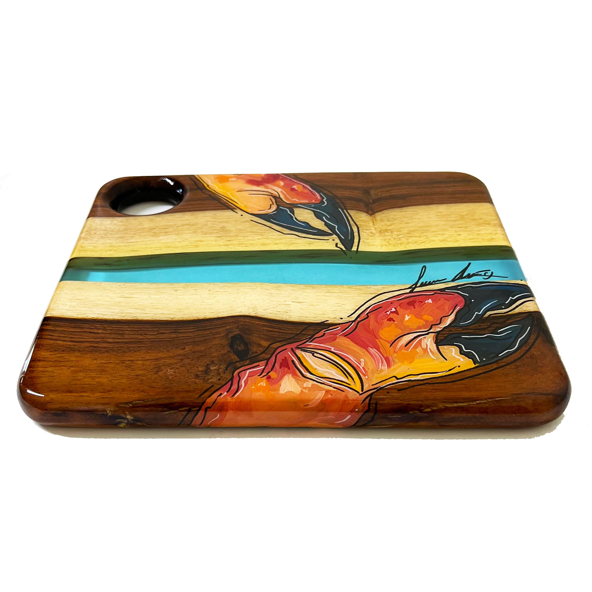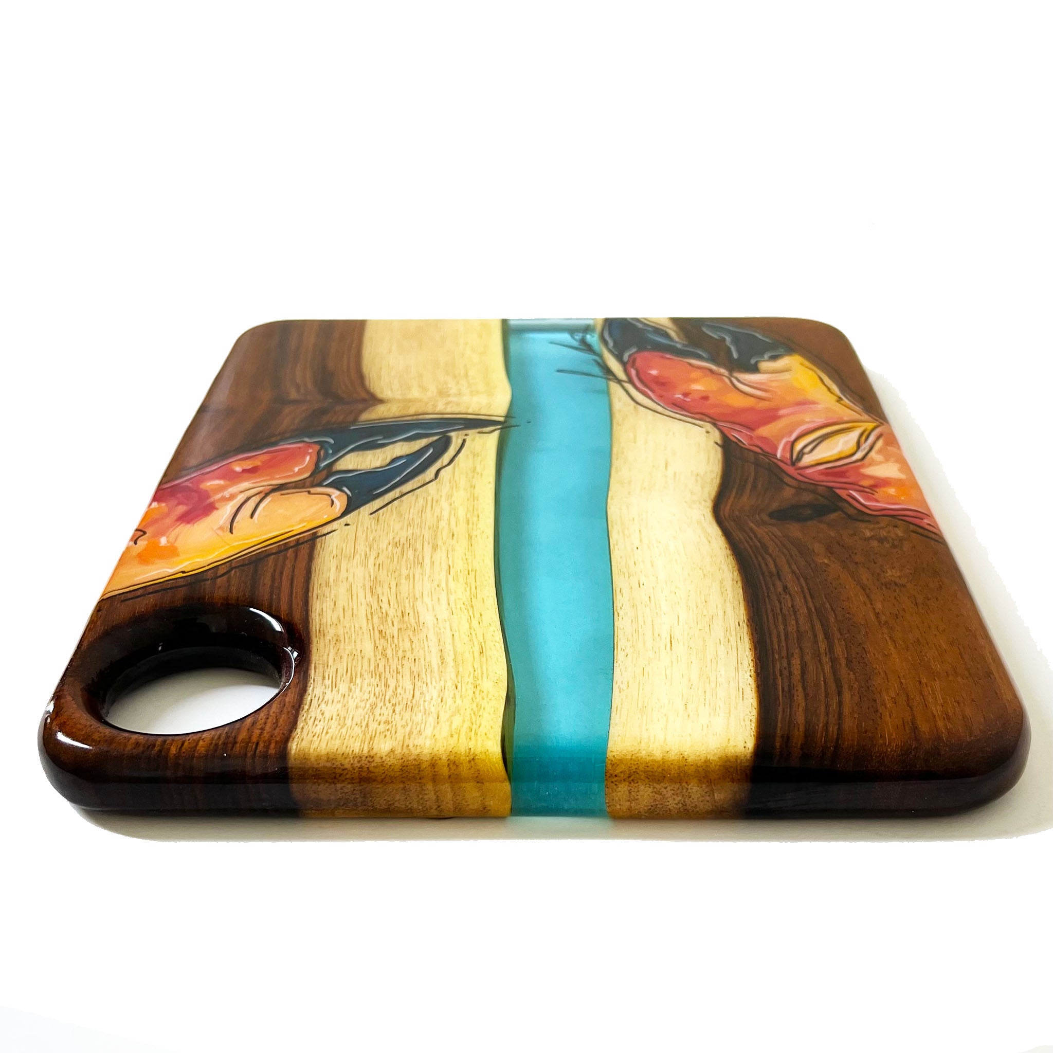 Our SERVING TRAYS have a full coat of epoxy finish. Our epoxy is all food safe but we do NOT recommend cutting on our SERVING TRAYS because the knife will scratch the epoxy finish.