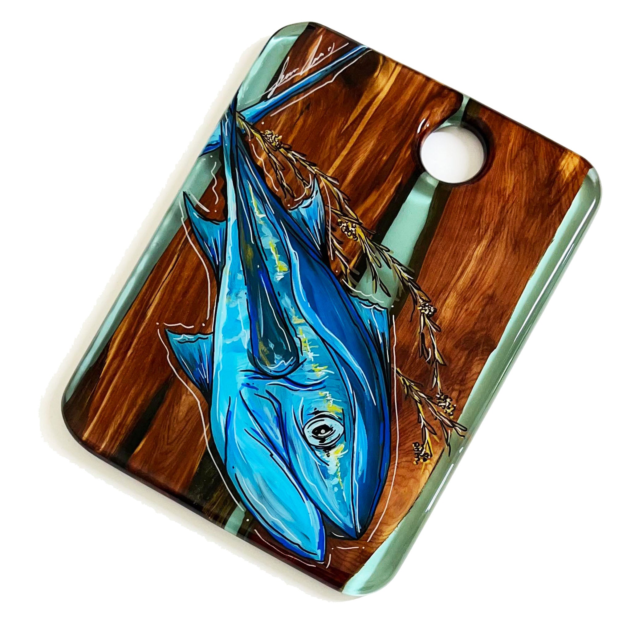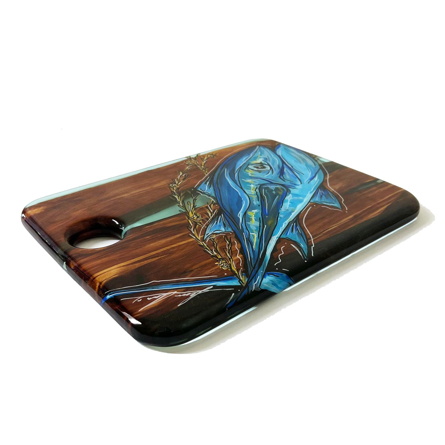 Our SERVING TRAYS have a full coat of epoxy finish. Our epoxy is all food safe but we do NOT recommend cutting on our SERVING TRAYS because the knife will scratch the epoxy finish.