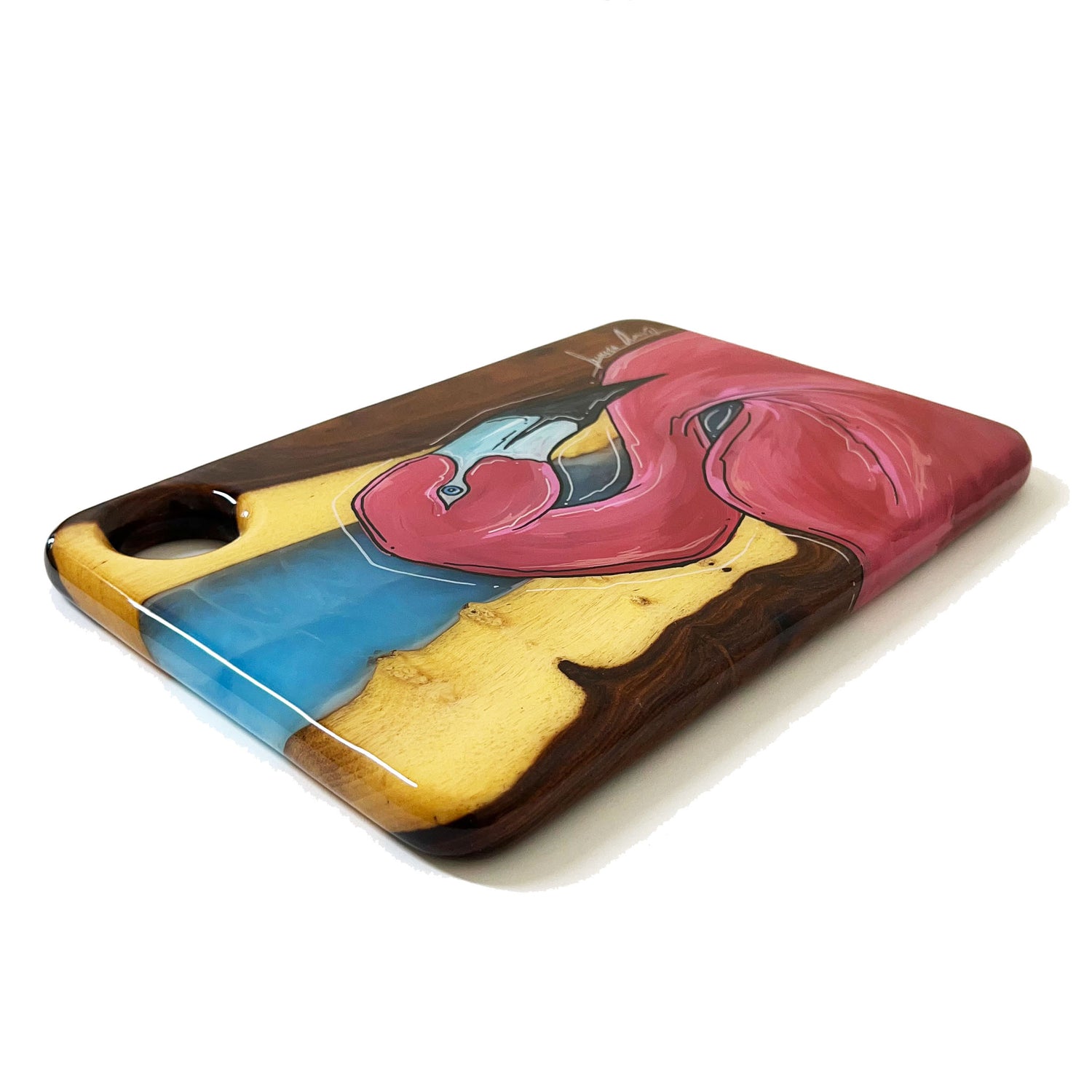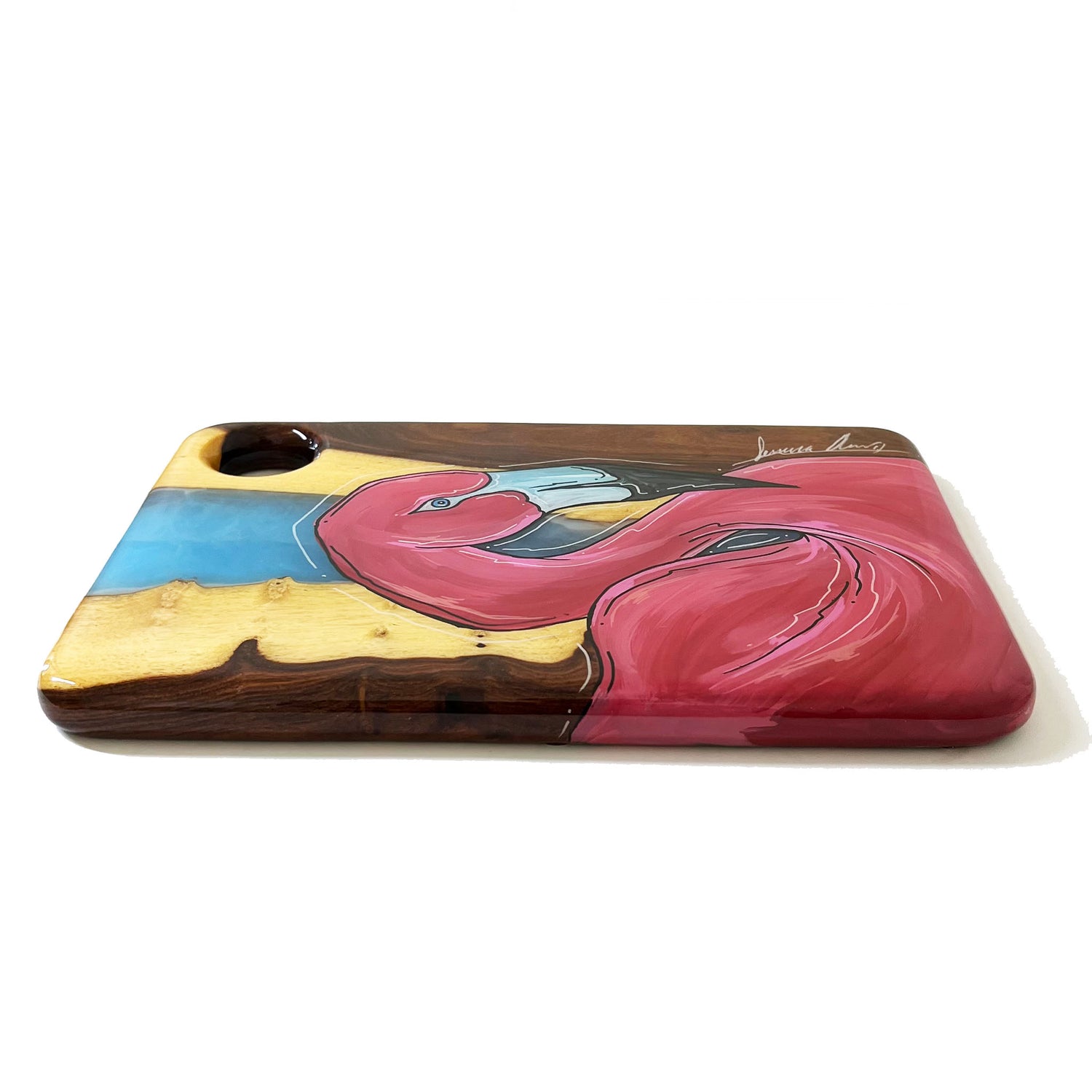 Our SERVING TRAYS have a full coat of epoxy finish. Our epoxy is all food safe but we do NOT recommend cutting on our SERVING TRAYS because the knife will scratch the epoxy finish.