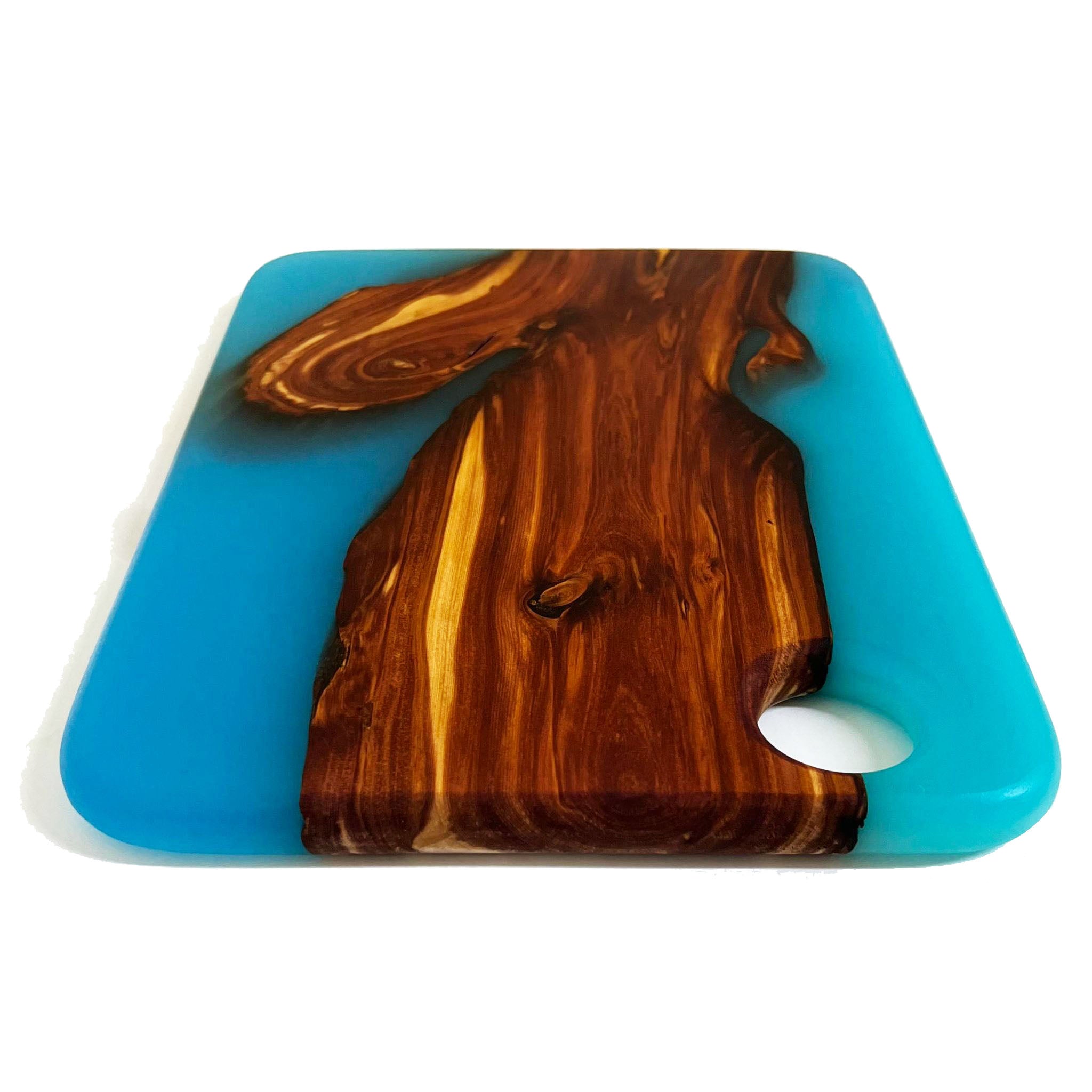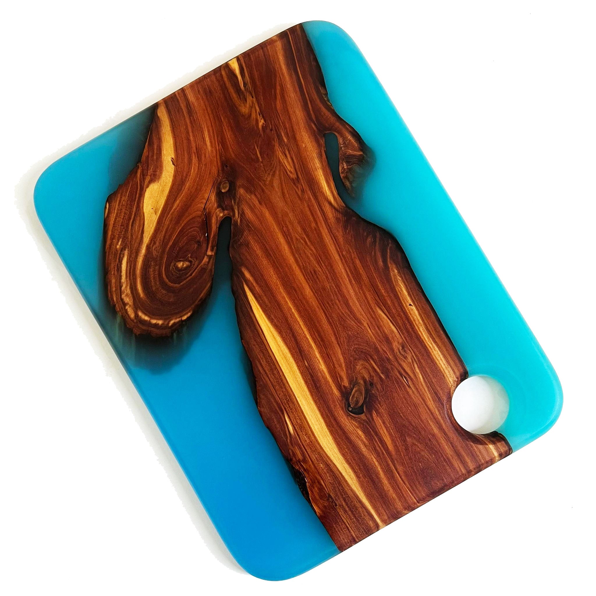 Our SERVING TRAYS have a full coat of epoxy finish. Our epoxy is all food safe but we do NOT recommend cutting on our SERVING TRAYS because the knife will scratch the epoxy finish.
