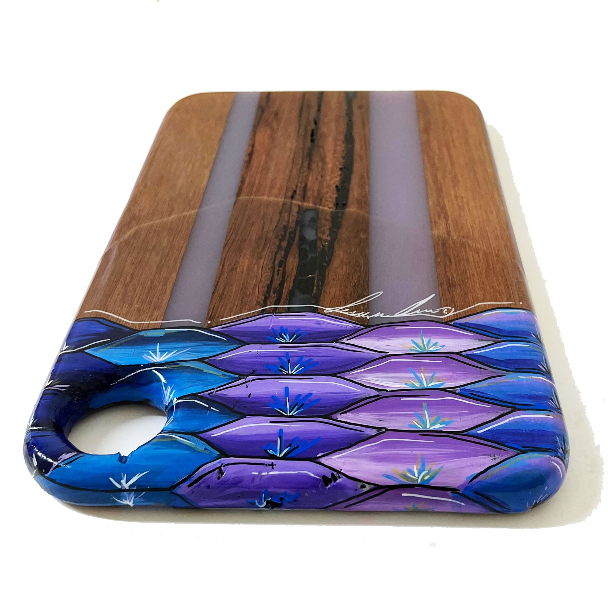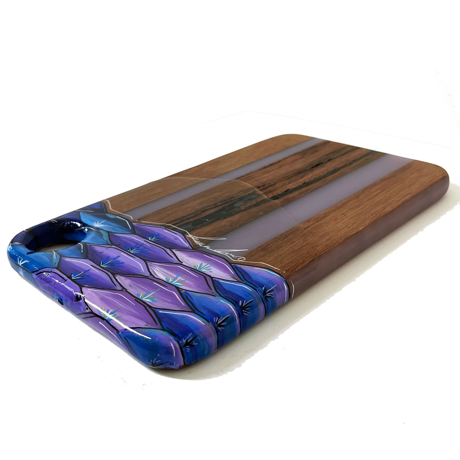 Our SERVING TRAYS have a full coat of epoxy finish. Our epoxy is all food safe but we do NOT recommend cutting on our SERVING TRAYS because the knife will scratch the epoxy finish.