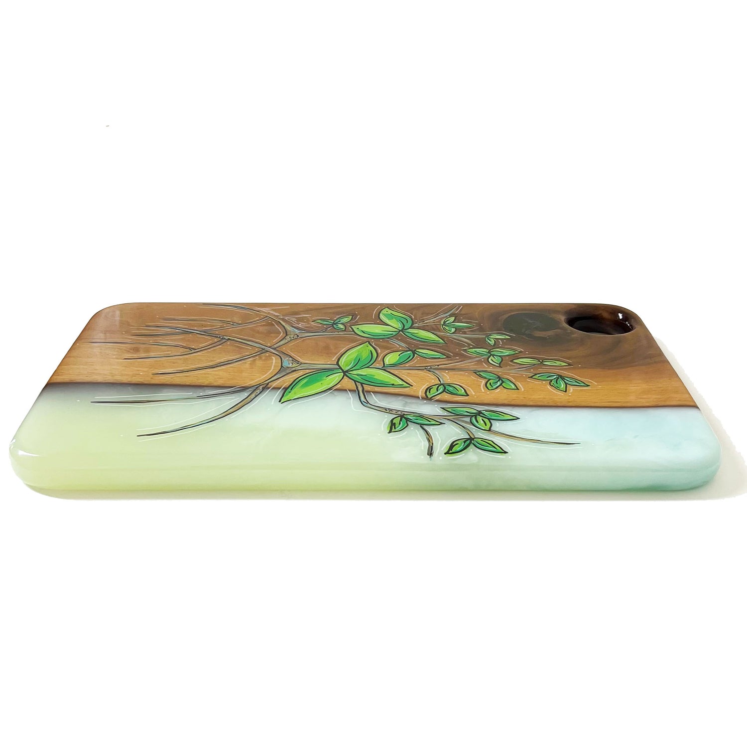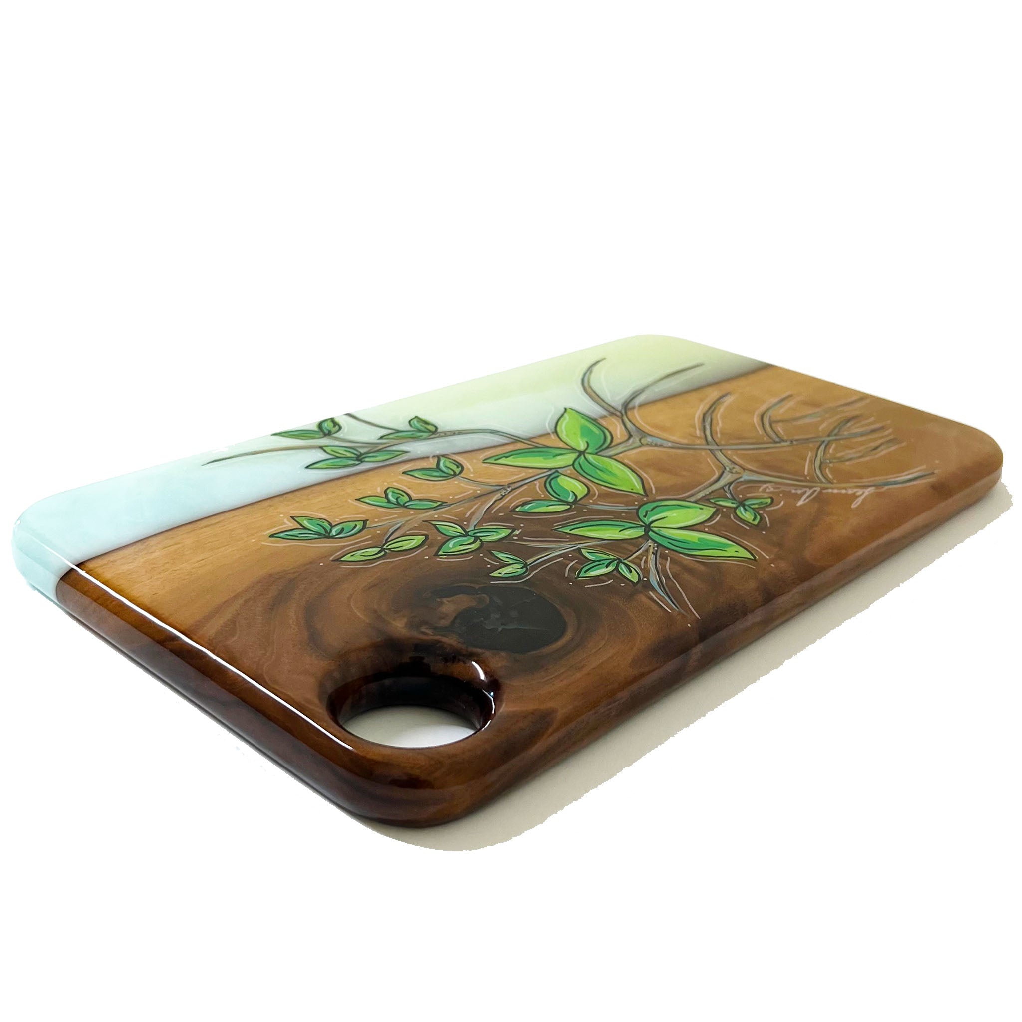 Our SERVING TRAYS have a full coat of epoxy finish. Our epoxy is all food safe but we do NOT recommend cutting on our SERVING TRAYS because the knife will scratch the epoxy finish.