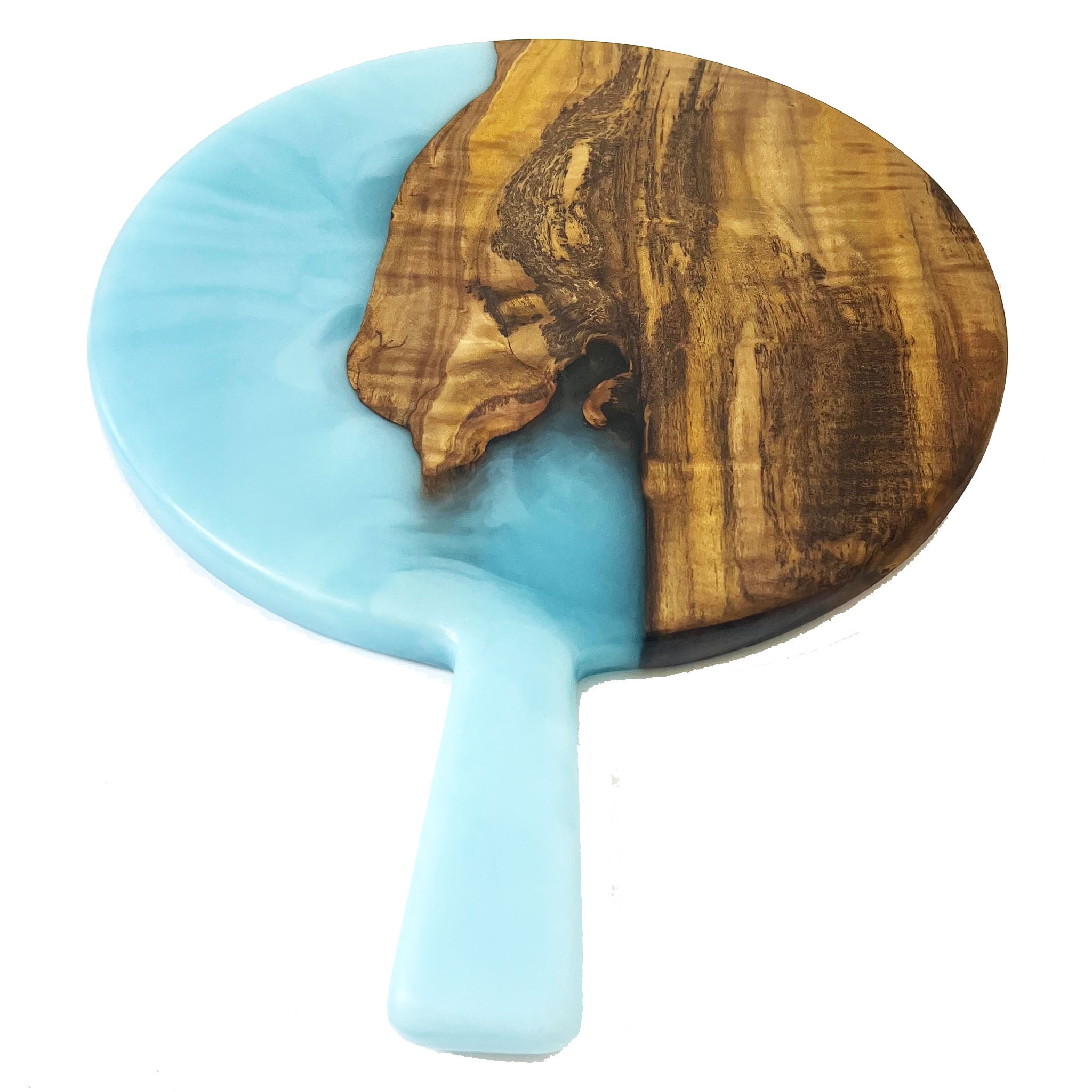 This CUTTING BOARD is hand shaped, poured, and painted by hand.
