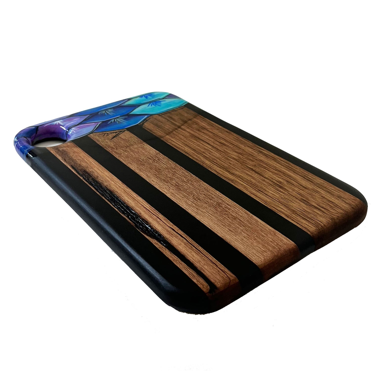Our SERVING TRAYS have a full coat of epoxy finish. Our epoxy is all food safe but we do NOT recommend cutting on our SERVING TRAYS because the knife will scratch the epoxy finish.