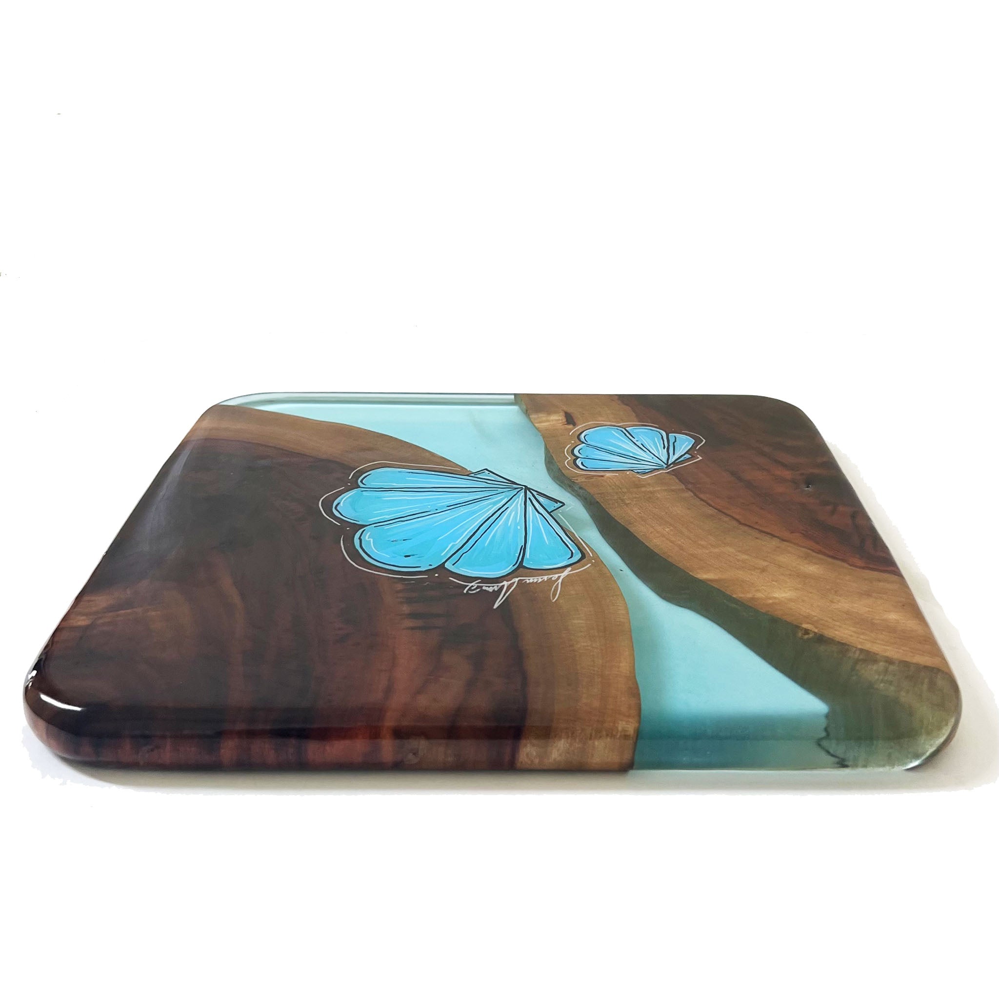 Our SERVING TRAYS have a full coat of epoxy finish. Our epoxy is all food safe but we do NOT recommend cutting on our SERVING TRAYS because the knife will scratch the epoxy finish.