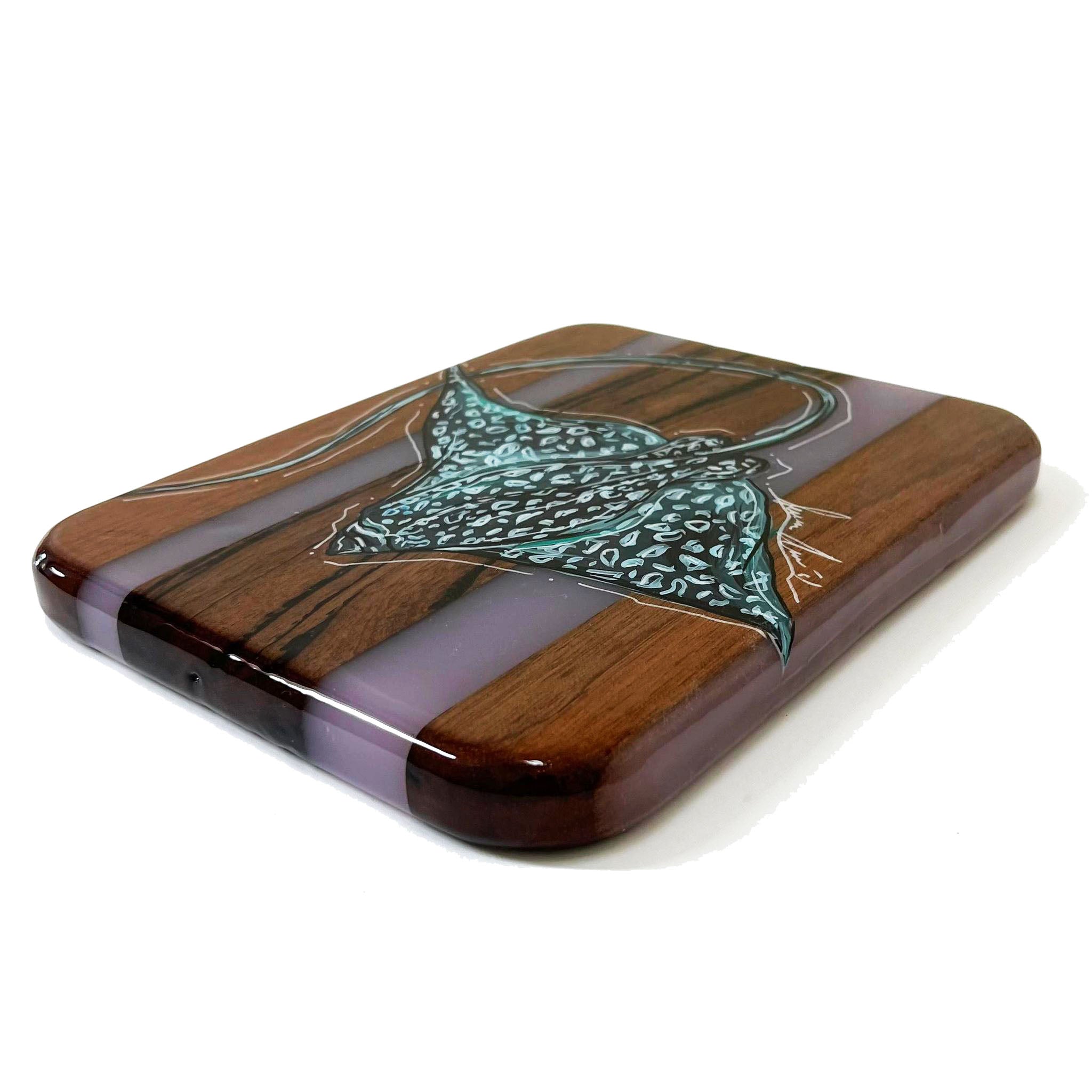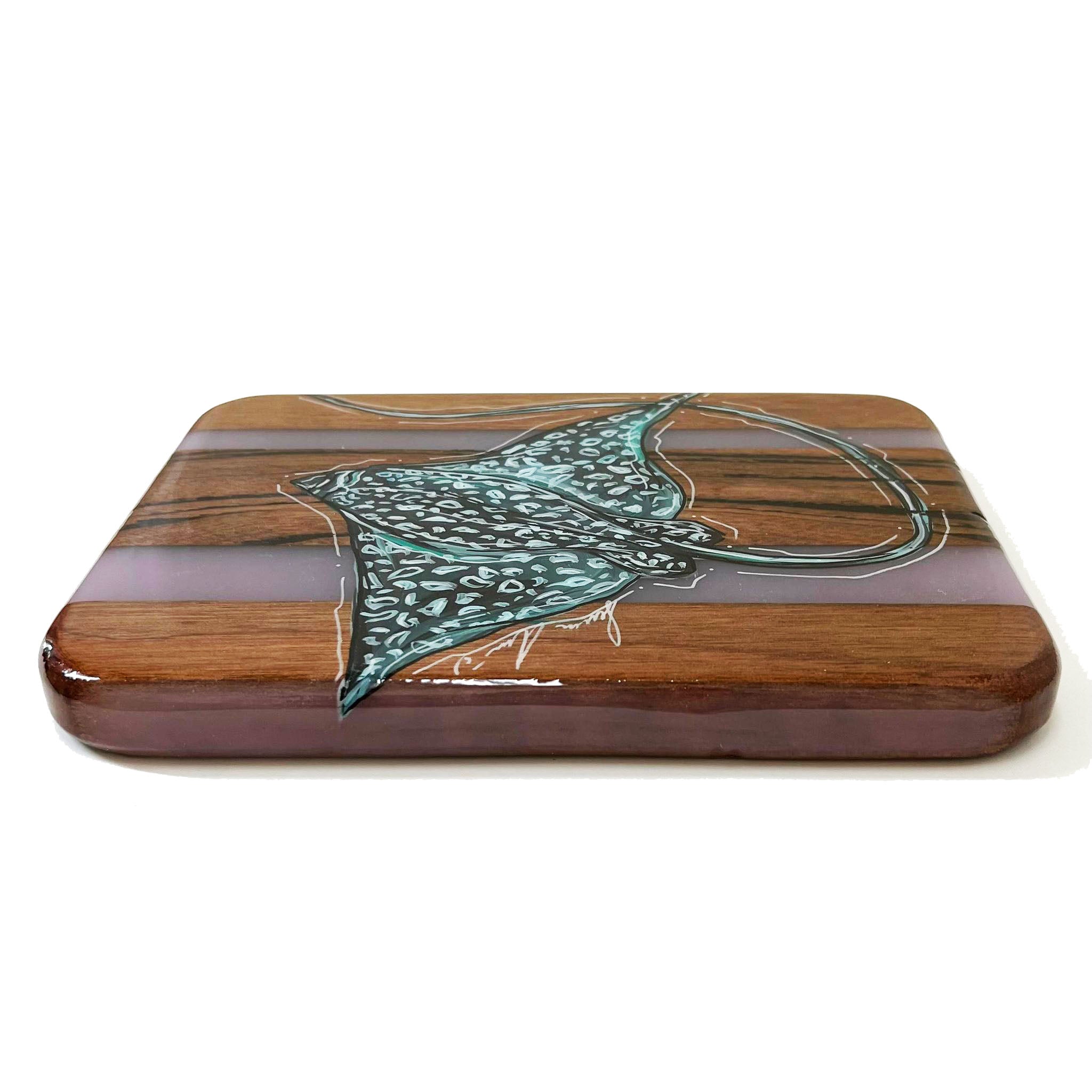 Our SERVING TRAYS have a full coat of epoxy finish. Our epoxy is all food safe but we do NOT recommend cutting on our SERVING TRAYS because the knife will scratch the epoxy finish.