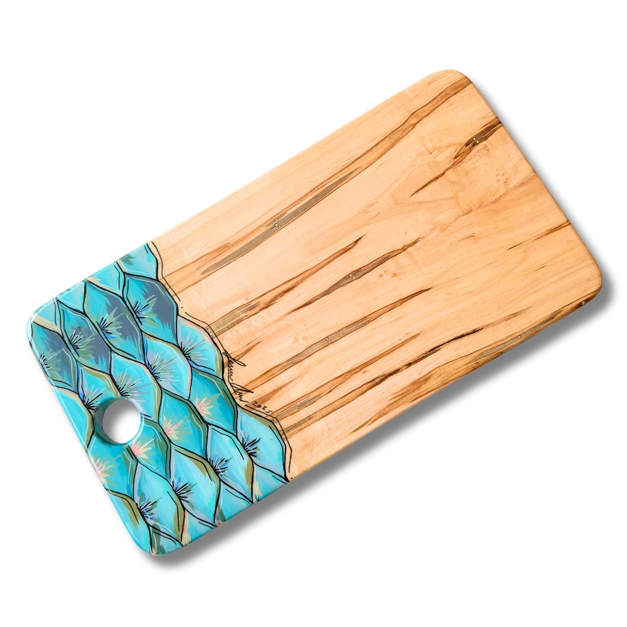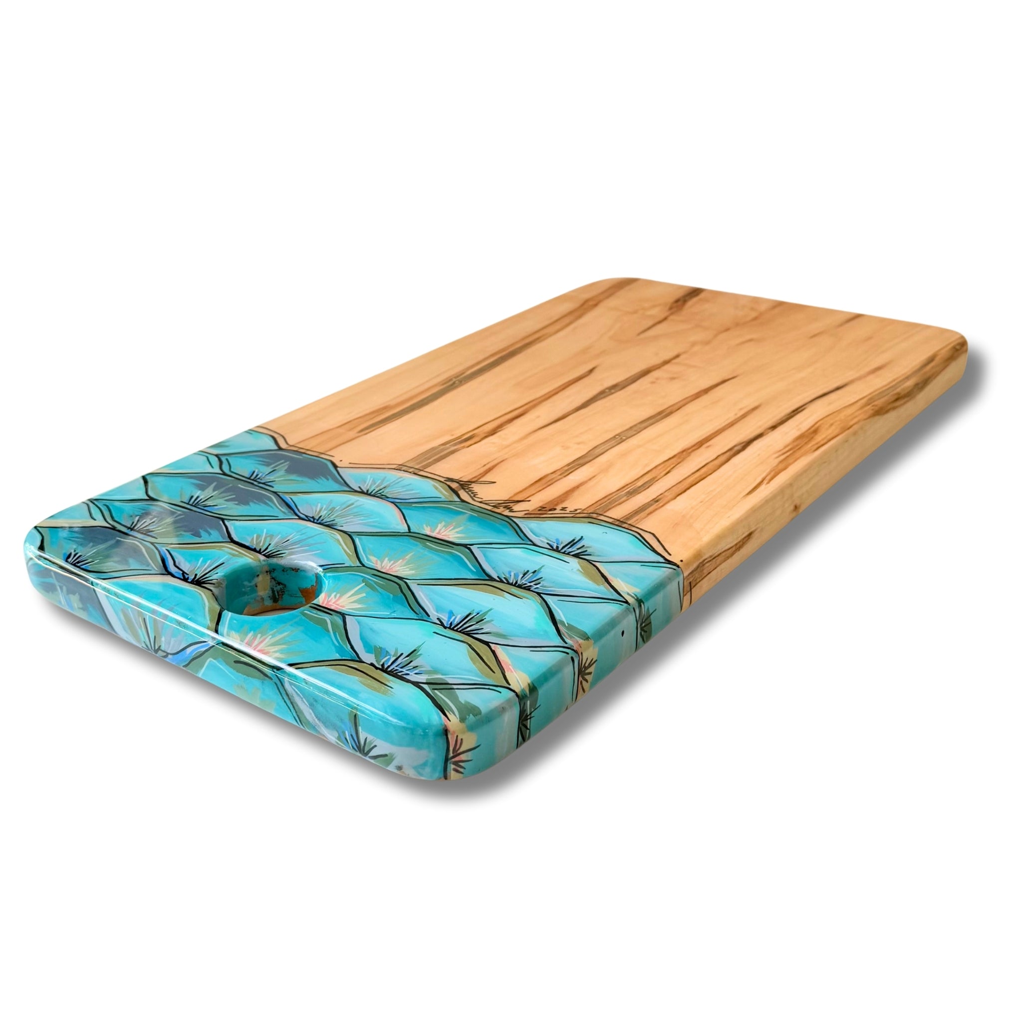 Each piece is sealed with a partial coat of food-safe epoxy that highlights the artwork while keeping the wood’s natural surface ready for everyday use. We recommend avoiding cutting directly on the epoxy areas to preserve the finish.