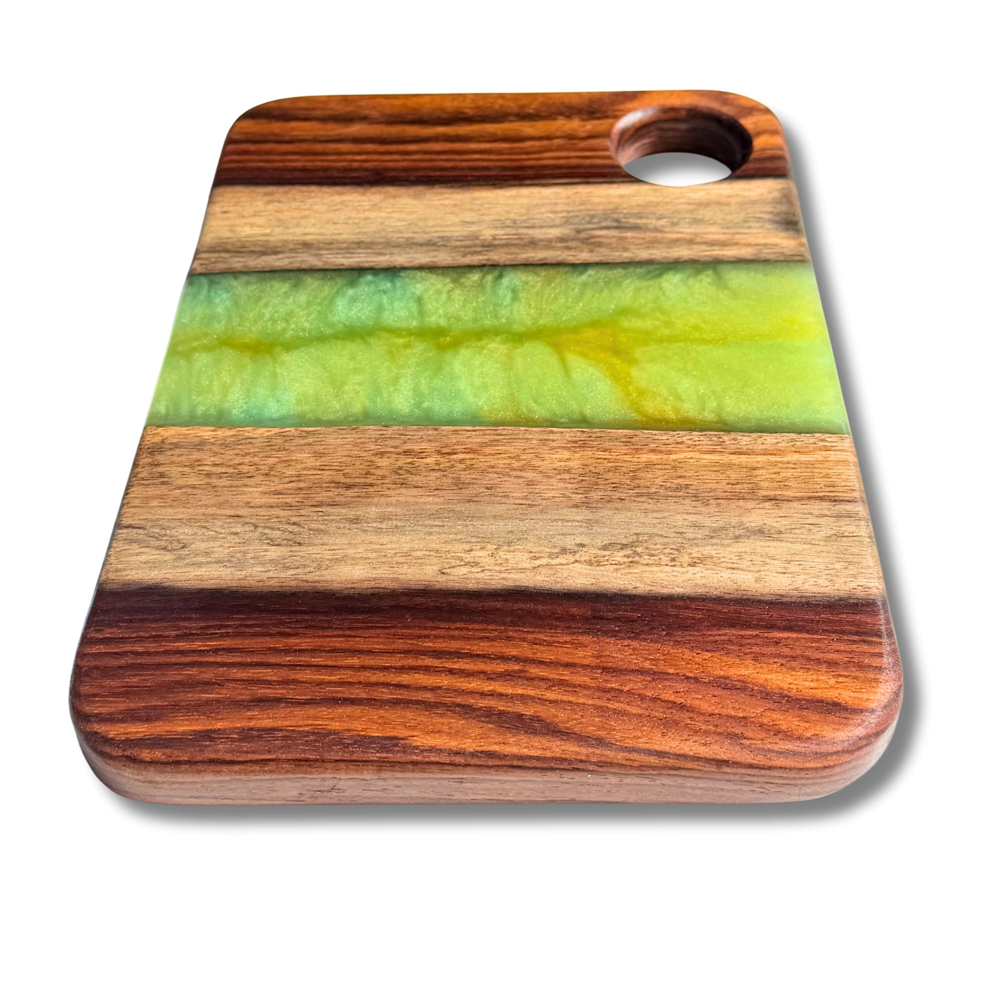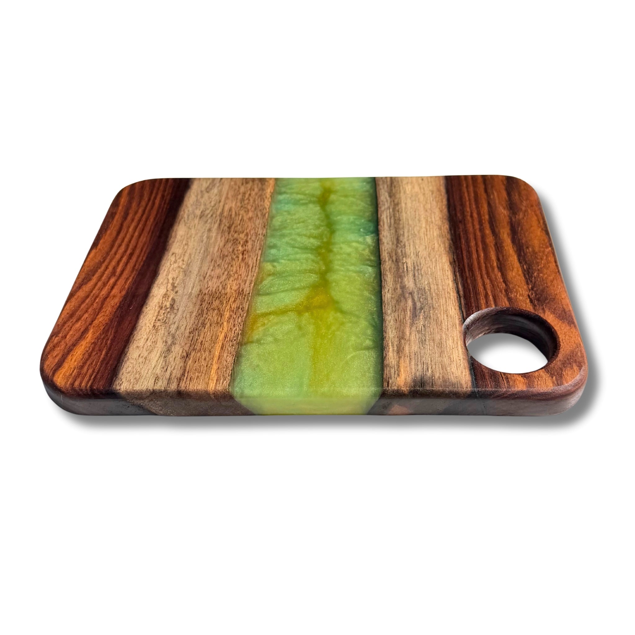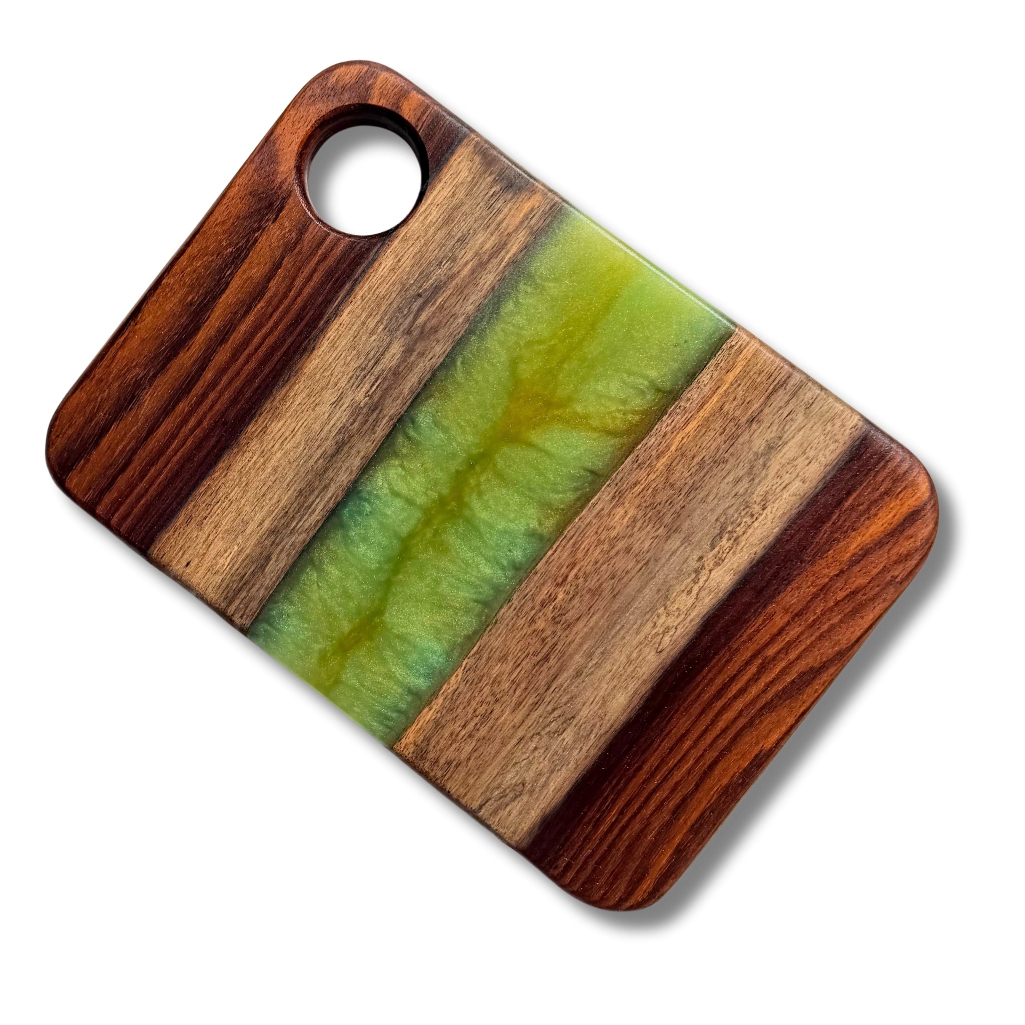 Each piece is sealed with a partial coat of food-safe epoxy that highlights the artwork while keeping the wood’s natural surface ready for everyday use. We recommend avoiding cutting directly on the epoxy areas to preserve the finish.