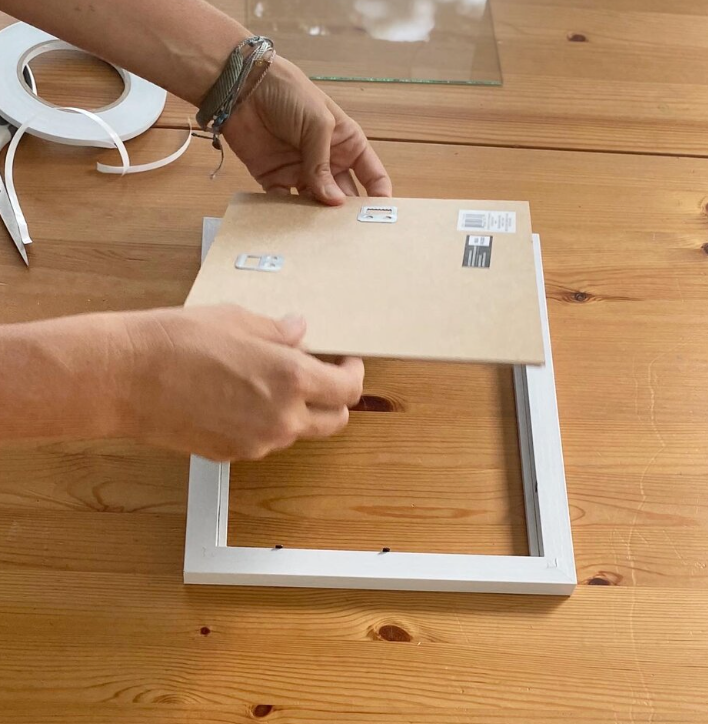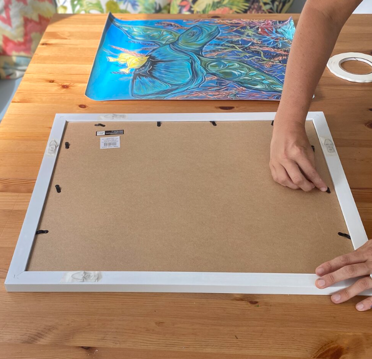 Now add the glass back in or leave out (your preference) and put the frame backer back in and close all the tabs to secure your print