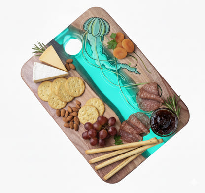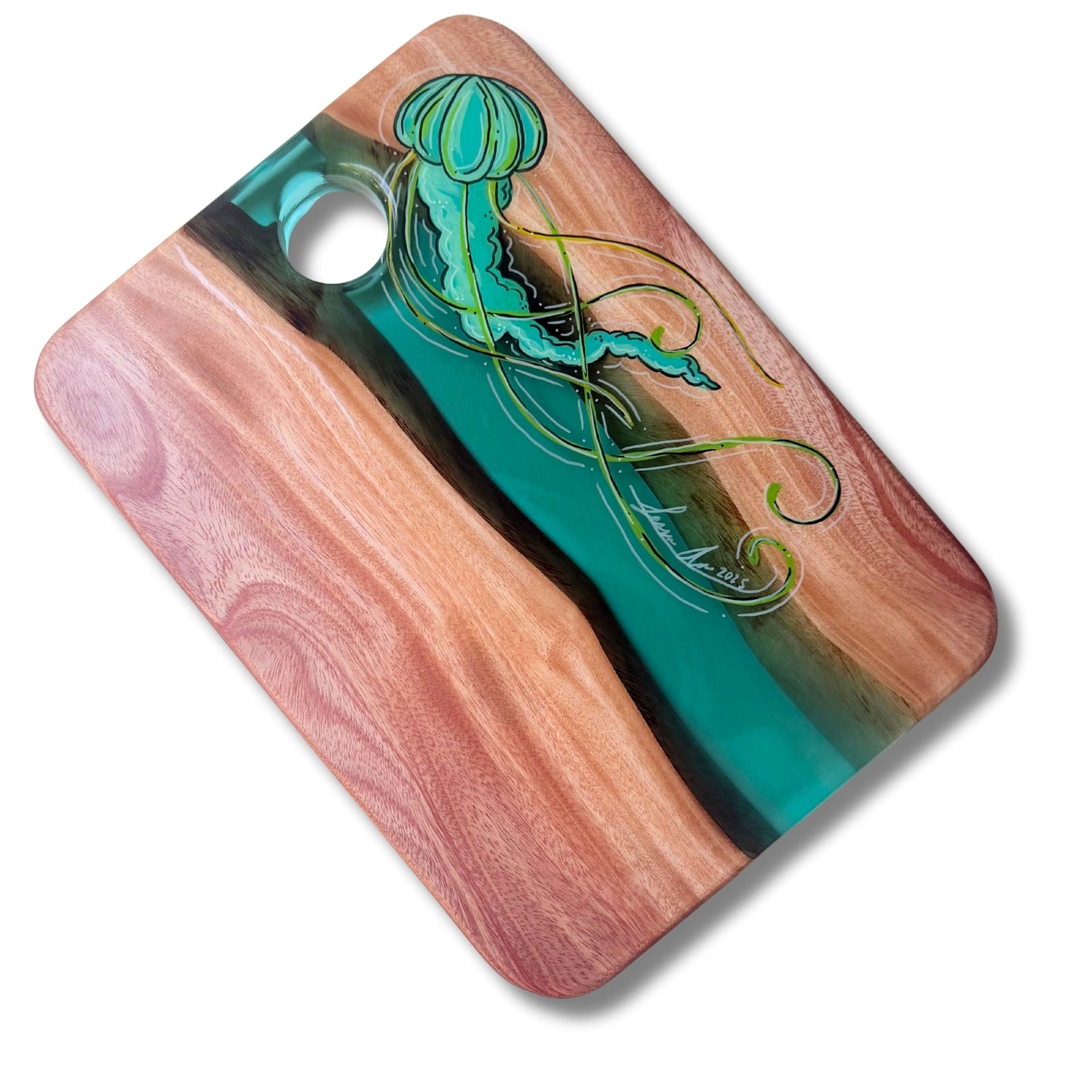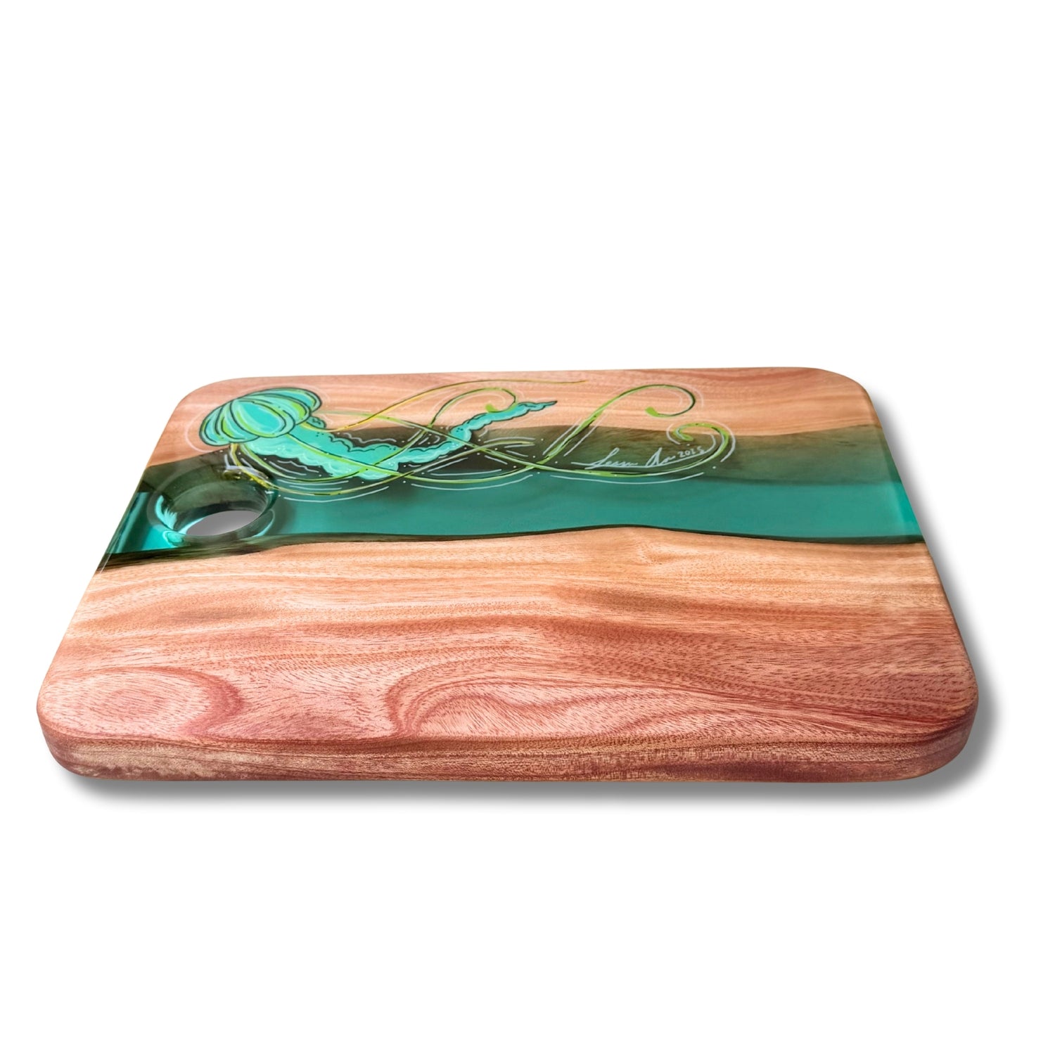 Each piece is sealed with a partial coat of food-safe epoxy that highlights the artwork while keeping the wood’s natural surface ready for everyday use. We recommend avoiding cutting directly on the epoxy areas to preserve the finish.