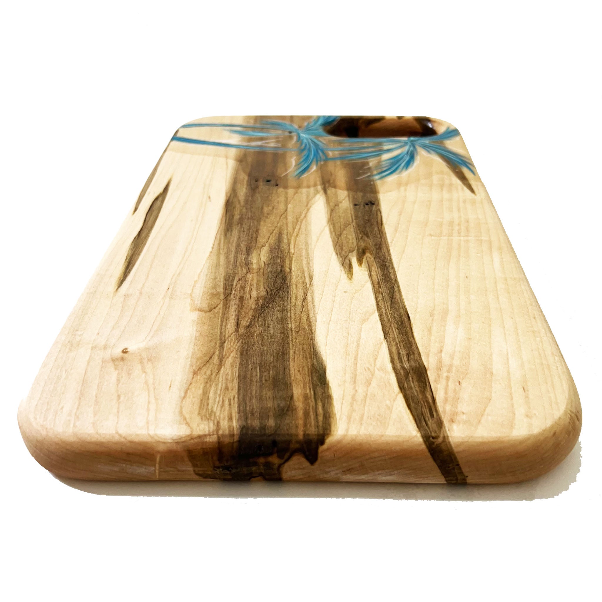 This CUTTING BOARD is hand shaped, poured, and painted by hand.